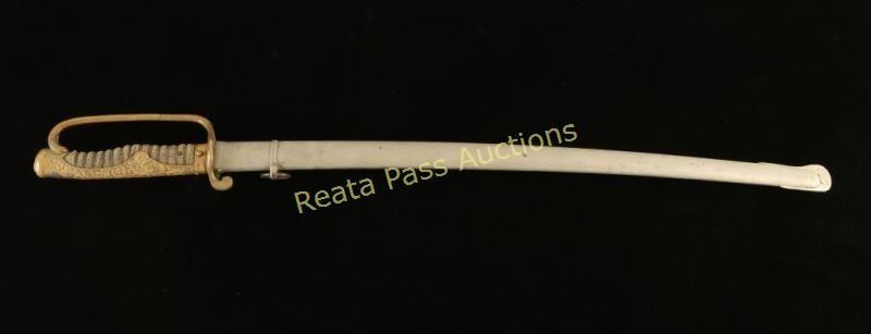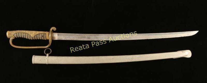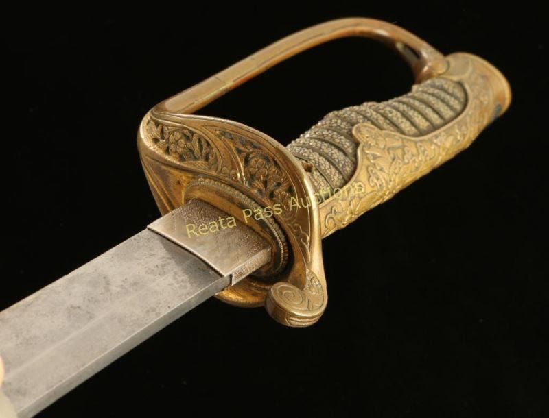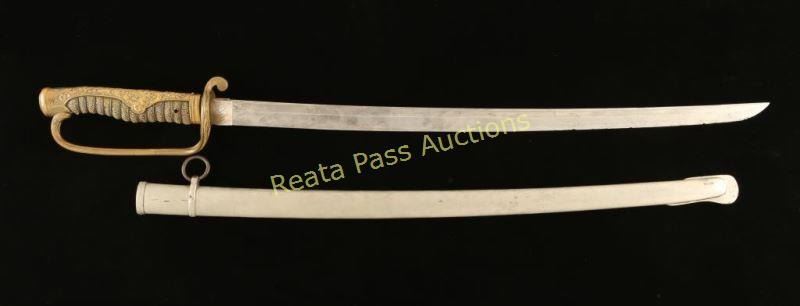 Family blade that is hand made. Wire wrapped handle with lizard skin. Floral engraved brass on front of handle and guard. Blade shows some pitting and serration to edge. Comes with metal sheath. Measures approx. 33 1/4" overall with a 23 5/8" blade.