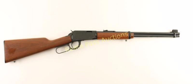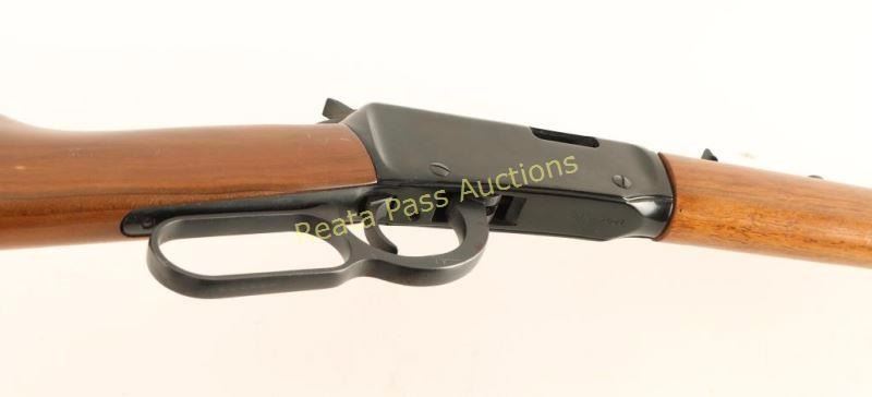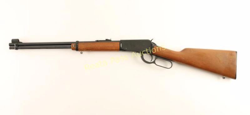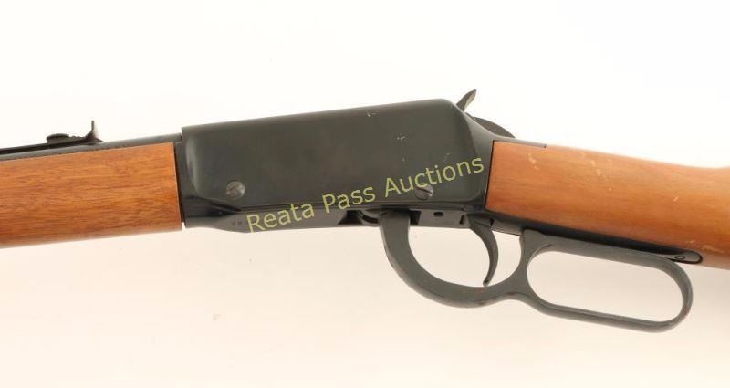 German made lever action repeating rifle chambered in .22 Long Rifle, produced by Erma 1973-1979. Features a blued 18.5" barrel, full length tube magazine, ramped & hooded blade front sight, adjustable rear sporting sight, serrated hammer spur & trigger, black finished receiver with integral scope rail, swivel studs, smooth walnut forend and straight grip shoulder stock with black hard rubber buttplate. The lower tang has "Mottl 79" scratched into it for the year and the man's last name who owned the rifle, his social security number is also inscribed. Rifle exhibits approximately 90% of it's original finish showing handling marks on the receiver and small scattered areas of light surface rust on the barrel. Action is smooth, bore is very good+ and wood stocks are very good. Condition is good to very good. ***Modern Firearm***
