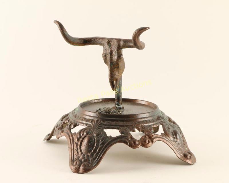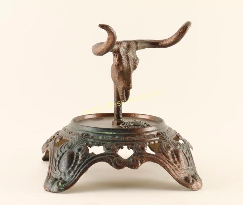 Bronze metal longhorn pistol holder sits atop an openwork flourished stand. Base of stand is accented with a horseshoe motif concho. 7 1/4"h x 9"w. Made by local AZ artist.