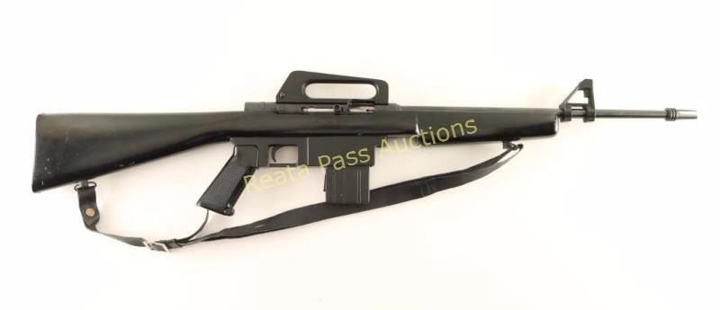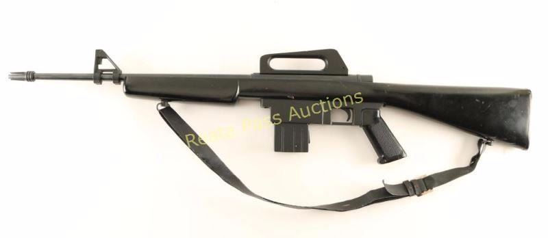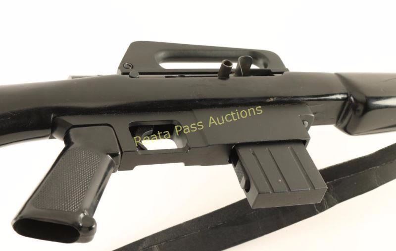 Filipino made semi-automatic rifle chambered in .22 Long Rifle, made to resemble a M16. Imported by Kassnar Imports of Harrisburg, P.A. with import marks on the barrel. Features a blued/black finish, 17.75" barrel with three-prong flash hider, A2 style front sight, removable carrying handle with fixed aperture sight, 10 round magazine, serrated trigger, manual safety, shell deflector, serrated round charging handle, black sling, A1 style checkered black synthetic pistol grip, and smooth black painted wood shoulder stock. Rifle exhibits approximately 96% of it's original finish showing light handling marks and some minor edge wear observed on the front sight & carrying handle. Action is strong, bore is excellent, and wood stock is good showing several blemishes. Condition is very good+. ***Modern Firearm***