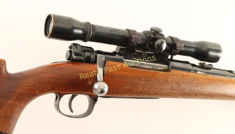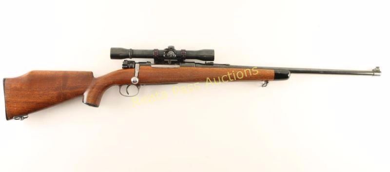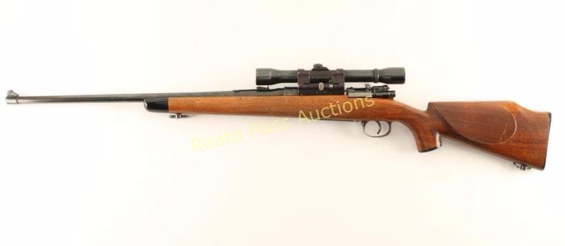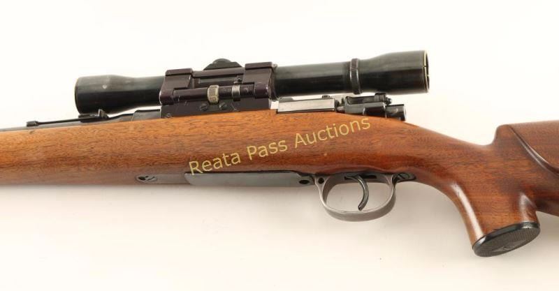 Sporterized, refinished German 98 military bolt-action battle rifle with a 23" barrel, Weaver K4 on Pachmayr roll-over mount, custom wood stock. sling swivels, black plastic forend tip, grip cap and butt plate (marked "Bishop"). All makers marks have been polished off the receiver. The replacement barrel has some edge wear and surface wear through the bluing. The bolt handle has been forged for bolt clearance and there is a 2-position scope safety. The bottom metal is turning to plum. Bore is bright and shiny with good rifling. Wood has a Monte Carlo comb with a cheek rest for a right-handed shooter. There are many dings and scrapes in the surface. Condition is good. *Modern Firearm C&R*