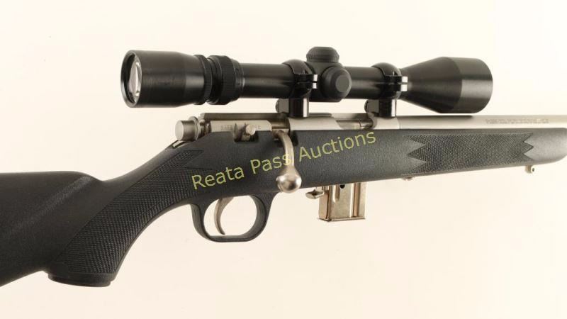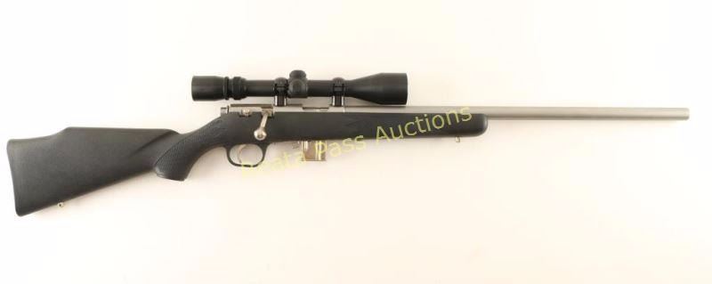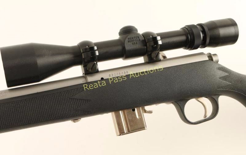 American made stainless steel bolt action sporting rifle chambered in .22 Magnum. Features a satin finish, heavy 22" micro-groove barrel with no provisions for sights, Redfield Hunter 3-9x scope, 7 round detachable magazine, serrated trigger, manual safety, swivel studs and checkered black synthetic pistol shoulder stock with high comb and integral trigger guard. Include the original factory cardboard box with documents. Rifle exhibits little to no visible wear. Action is sound, bore is excellent and synthetic stock is fine. Condition is like new in box.