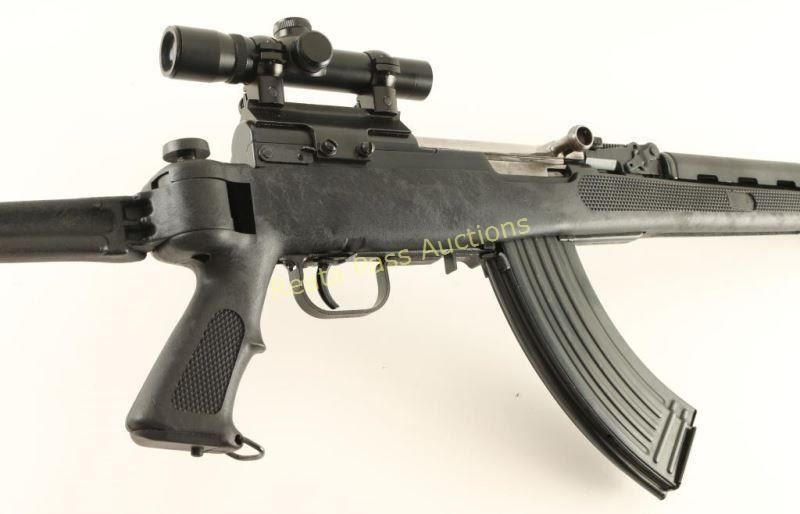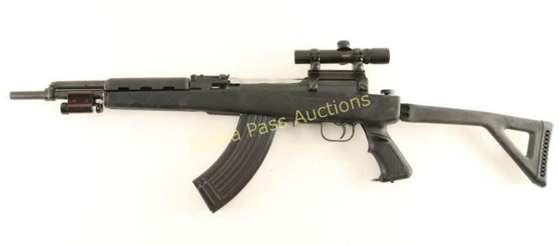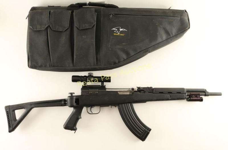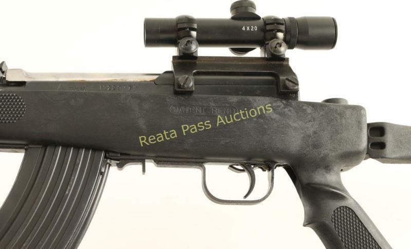 Customized Chinese SKS pattern semi-automatic rifle chambered in 7.62x39mm. Imported by C.A.I of St. Albans, V.T. with import marks on the barrel. Features a blued finish, 16.25" cut-down barrel, removed front sight, graduated rear sight, 4x 20mm scope on Poly Tech mount, laser sight with tape switch, manual safety, 30 round steel magazine, smooth trigger, black synthetic hand guard and checkered pistol grip side-folding stock. Includes a Galati Int'l padded soft case with an extra 30 round magazine, manual, tool, laser battery and Chinese schematics. Serial numbers match on the receiver, bolt and triggerguard. Rifle exhibits light scattered oxidation with little to no visible wear. Action is crisp, bore is excellent and synthetic stock is fine. Condition is near excellent. ***Modern Firearm***
