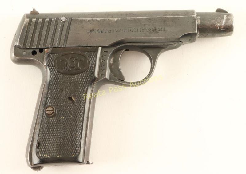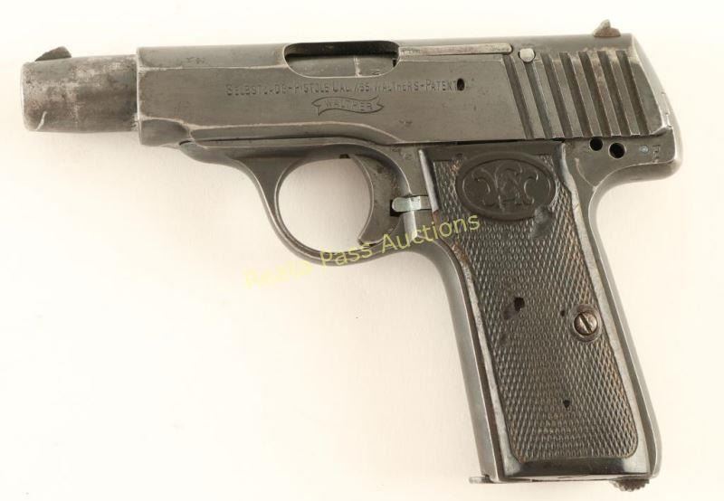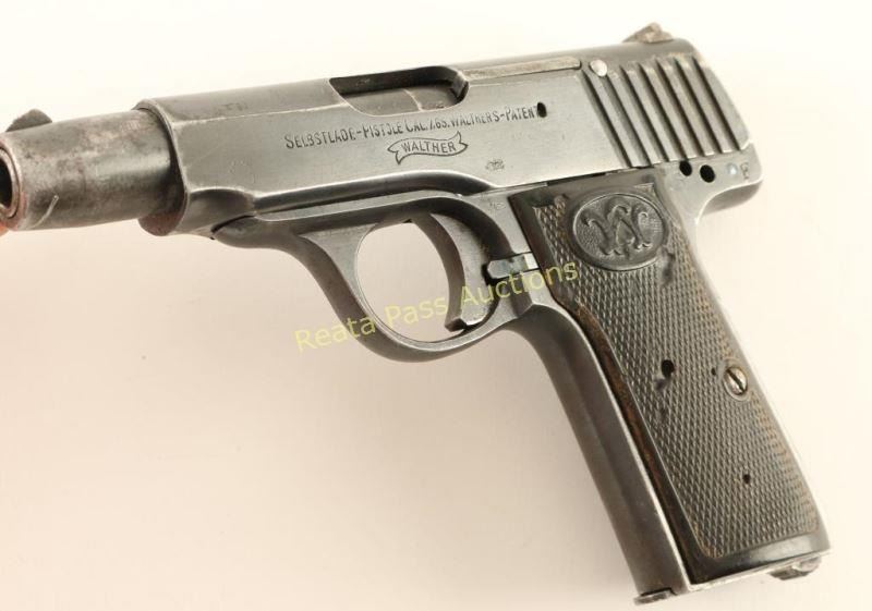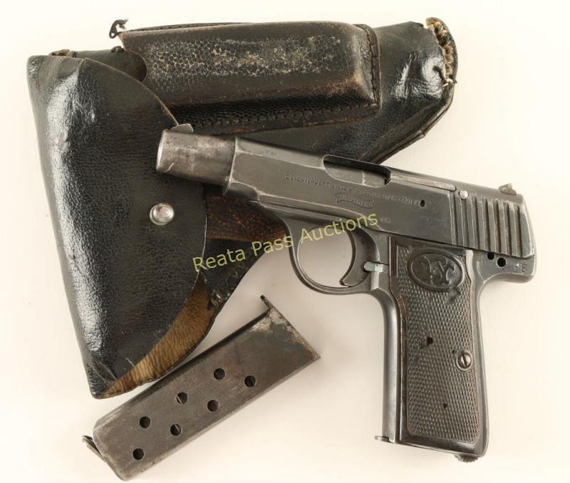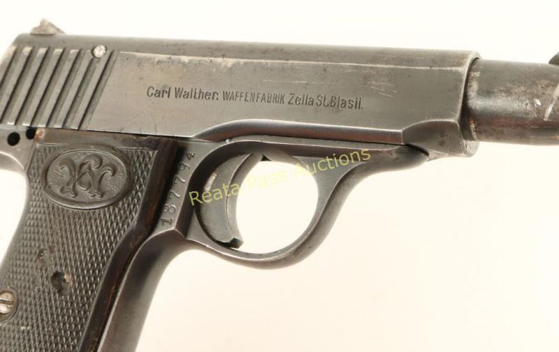 'Late Second Variation' German made blowback-operated semi automatic pistol chambered in 7.65mm, circa 1915-1920. Features a blued finish, 3.5" barrel, blade front sight, dovetailed rear window sight, smooth trigger, 8 round magazine, and two-piece checkered hard rubber grips with Walther logo on each grip. Includes a black leather belt loop flap holster with spare magazine. No import marks. Markings: Slide - "SELBSTLADE-PISTOLE CAL.7,65.WALTHERS-PATENT", Walther banner, nitro proof & "Carl Walther. WAFFENFABRIK Zella St.Blasii.". Frame - nitro proof & "187794". Barrel - nitro proof. Pistol exhibits approximately 66% of it's original blued finish showing heavy holster wear, a bright scratch on the barrel shroud and finish loss on the grip straps. Missing a safety, hammer & some small internal parts. Action is smooth, bore is good with some light scattered pitting, and the hard rubber grips are fair with several small losses. Condition is good as parts. ***C&R Firearm*** ***Modern Firearm***