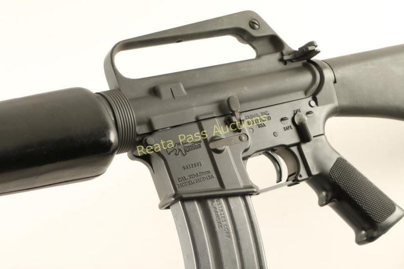 CMMG Mdl MOD4SA 5.56mm SN: SA12601 Put together AR platform rifle utilizing quality parts. Features a Colt 20" chrome bore barrel, A1 birdcage style flash hider, adjustable winged post front sight with bayonet lug, Colt carry handle upper receiver with adjustable dual aperture rear sight & large pivot pin hole, triangular black synthetic handguard, full-auto bolt carrier group(not colt), dust cover, black nylon sling, smooth single stage trigger, 30 round steel magazine, manual safety, checkered A2 style pistol grip and smooth black synthetic A2 style shoulder stock with trapdoor buttplate. The upper has a matte grey finish showing mild handling marks and scattered light surface rust found on the flash hider, barrel and front sight. The lower has a matte black finish that bears very little wear. The threads for the pistol grip appear stripped. Action is smooth, bore is bright with semi-warn rifling and stocks are very good. Condition is good to very good. ***Modern Firearm***