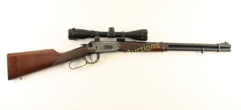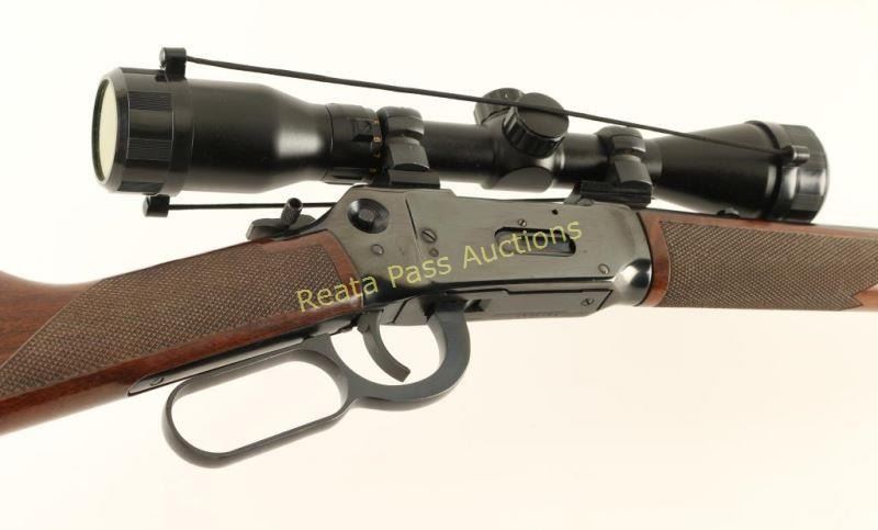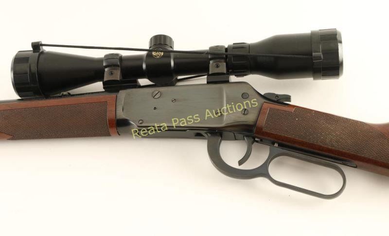 Big bore lever action repeating rifle chambered in .444 Marlin. Features a blued finish, 20" tapered barrel, ramped blade front sight, black inserted into the rear sight dovetail, Pine Ridge 3-9x 40mm scope, full-length tube magazine, push button safety, grip safety, checkered hammer spur extension, beveled trigger, swivel studs, checkered walnut forend and straight grip shoulder stock with factory recoil pad. Rifle exhibits approximately 93% of it's original finish showing a few superficial scratches on the receiver and some light scattered surface rust emerging on the barrel. Action is smooth, bore is pristine and wood stocks are fine. Condition is very good++. ***Modern Firearm***