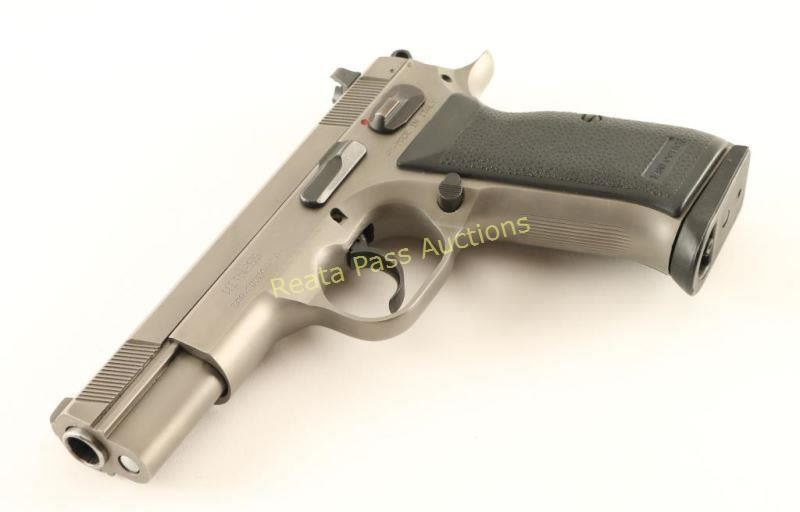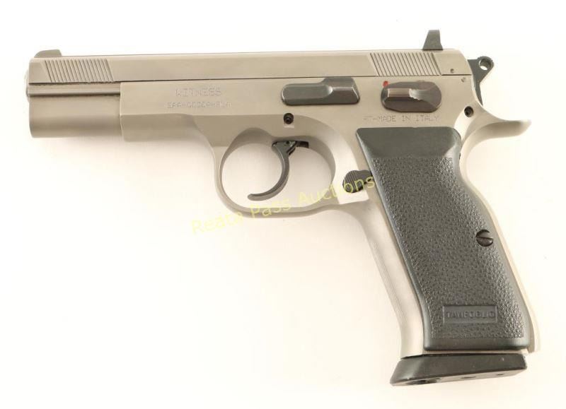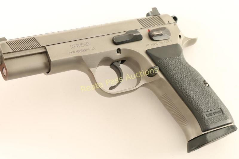 European American Armory 'Witness' semi-automatic, DA/SA, "Wonder" finished, detachable box magazine fed pistol with one magazine, 4-1/2" barrel, textured rubber grips and blued bolt stop, safety, hammer, trigger, mag release and rear sight. Sights are fixed 3-dot type. Bluing has wear on the high points. Bore is shiny with good rifling. Action works well. Grips are immaculate. Condition is very good. *Modern Firearm*