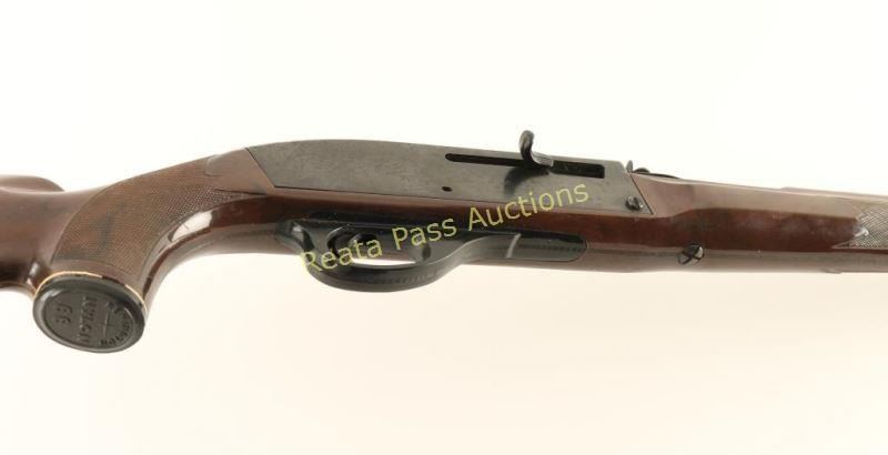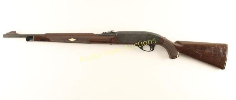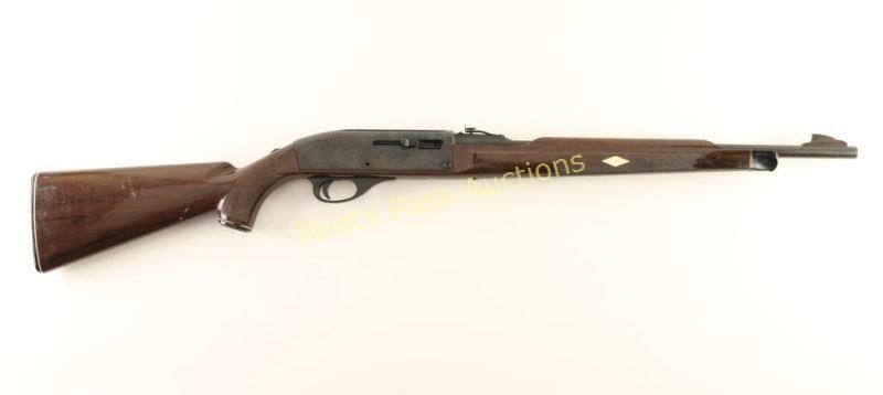 Blued, semi-automatic, through the butt tube magazine fed rifle with a 19.5" barrel, wood-grain nylon stock with black nylon forend tip, trigger guard, grip cap, and buttplate. Has iron sights with rear adjustable for windage and elevation. Bluing has spots and freckles of surface rust. Muzzle and front sight have edge wear. Action seems to work well. Bore is bright and shiny with good rifling. Nylon has scratches and scrapes. Condition is fair to good. *Modern Firearm*