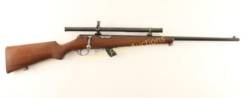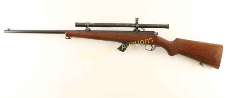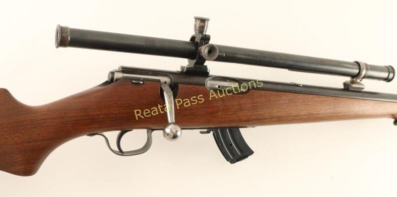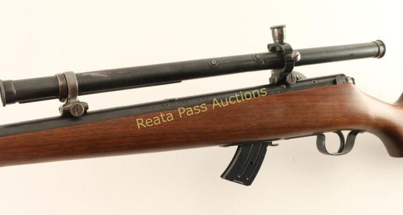 Vintage magazine fed bolt-action sporting rifle chambered in .22 Long Rifle, circa 1933-1942. Features a blued finish, 23 3/8" barrel, blade front sight, black inserted into the rear sight dovetail, Lyman 438-Field fixed power scope with adjustable rings, drilled & tapped receiver, 10 round magazine, manual safety, smooth trigger, bent bolt handle with round know, sling swivels and a one-piece smooth walnut pistol grip shoulder stock with schnabel forend & serrated metal buttplate. Rifle exhibits approximately 87% of it's original blued finish showing light wear and thinning. Action performs well though the supplied magazine is not correct to the rifle but it did feed during testing, bore is pristine, optics are clear and wood stock is very good+ with several small marks on the right side of the butt stock. Condition is very good. ***C&R Firearm*** ***Modern Firearm***