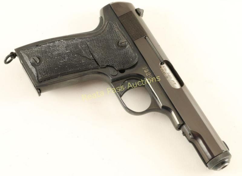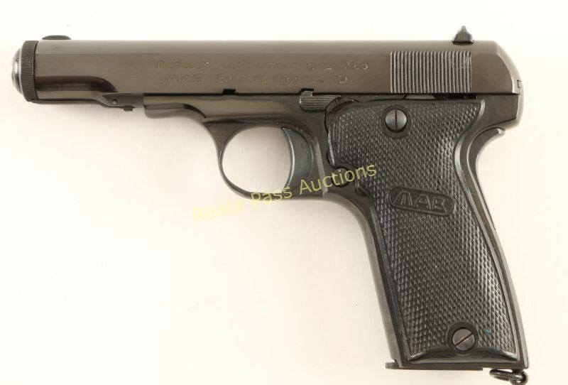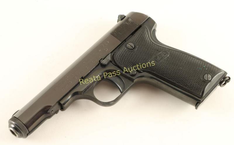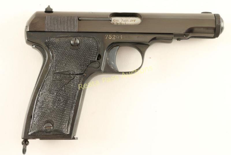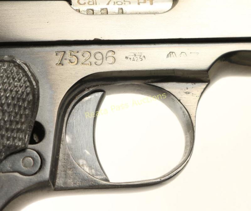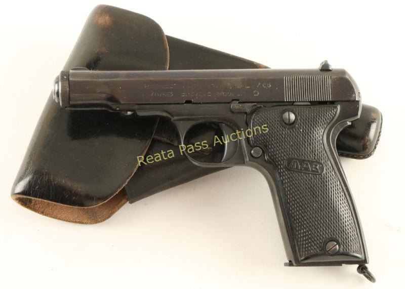 Nazi proofed semi-automatic pistol built along the lines of the FN 1910, chambered in 7.65mm and produced in France circa 1939-1945. Features a blued refinish, 4.2" barrel, low-profile patridge front sight, dovetailed rear window sight, steel frame, smooth trigger, thumb safety/slide stop, grip safety, 8 round magazine, lanyard ring and two-piece MAB checkered black plastic grips. Includes a smooth black leather belt loop flap holster marked "Munstermann/2. Polizeirevier". No import marks. Markings: Slide - "PISTOLE AUTOMATIQUE CAL 7.65/MAB BREVETE MODELE D". Frame - Eagle/WaA251, "75296" & "MAB". Barrel - "MAB", Eagle/swastika, "Cal 7.65" & "PT". Pistol retains approximately 95% of it's blued refinish showing slide wear on the trigger, a few spots of light pin-prick pitting around the triggerguard and a small area of the same pitting on the slide near the muzzle. Action is smooth, bore is good and plastic grips are fair showing a large amount of heat damage. Condition is good as refinished. ***C&R Firearm*** ***Modern Firearm***