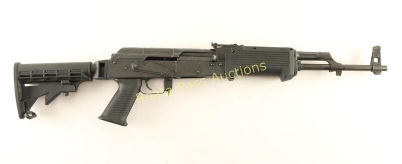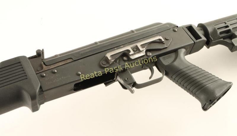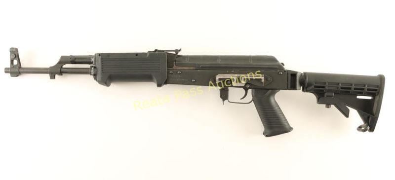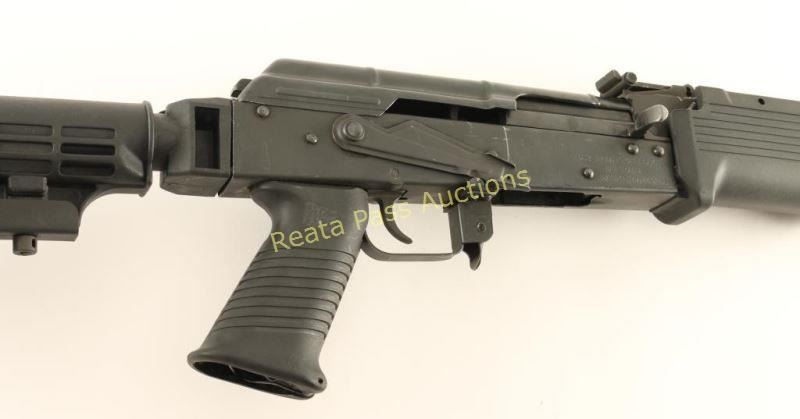Romanian semi-automatic copy of the AK-47 rifle chambered in 7.62x39mm. Features a matte black finish, 16.25" non-threaded barrel, shrouded post front sight, graduated rear sight to 1,000 meters, side mounted scope rail on the receiver, shaved bayonet lug, manual safety, smooth trigger, no magazine, Tapco Galil style black synthetic forend and 6-position collapsible shoulder stock. Rifle retains approximately 90% of it's black finish showing light scattered wear & handling marks on the receiver, a few small spots of light surface rust observed on the barrel and scattered light oxidation on the top cover. The scope mount on the receiver is bright along the rails as it was cleaned of filed to easily accept an accessory. Action is smooth, bore appears excellent with debris, and synthetic stocks are fine. Condition is very good. ***Modern Firearm***