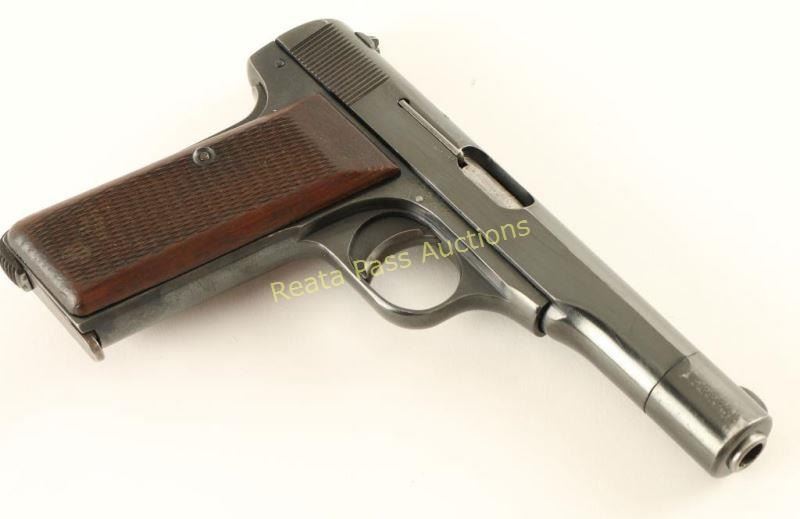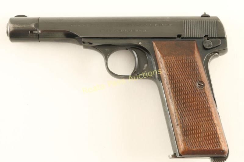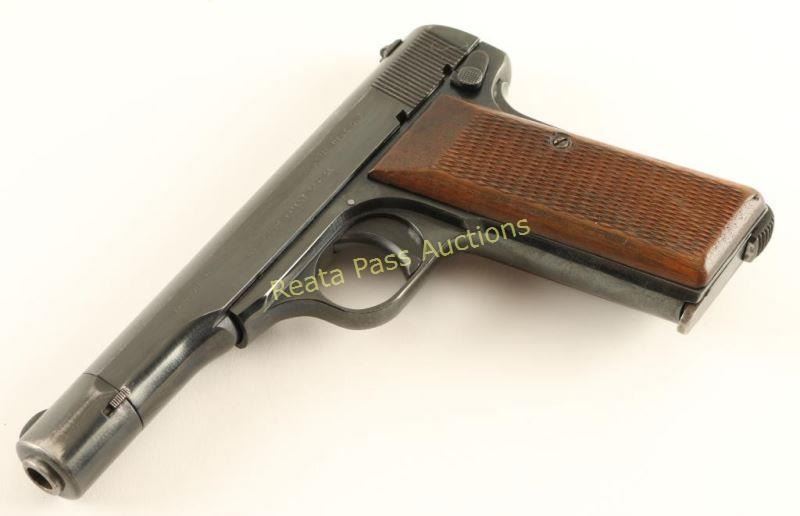 Nazi proofed semi-automatic pistol chambered in 7.65mm, produced in Belgium circa 1940-1944. Features a nicely reblued finish, 4.5" barrel, blade front sight, dovetailed rear window sight, steel frame, smooth trigger, manual safety, grip safety, 9 round factory magazine and two piece checkered wood grips. No import marks. Markings: Slide - "FABRIQUE NATIONALE DARMES DE GUERRE HERSTAL BELGIQUE", "BROWNING'S PATENT DEPOSE" & "122932" stamped on the inside. Frame - Eagle/swastika, "122932", & "MR". Barrel - Eagle & "122932". Barrel bushing - "122932". Magazine - Eagle/WaA140 & FN logo/765m/m. Pistol exhibits approximately 90% of it's blued refinish showing holster wear and light handling marks. Action is sound, bore is excellent and wood grips are very good. Condition is very good as refinished. ***C&R Firearm*** ***Modern Firearm***