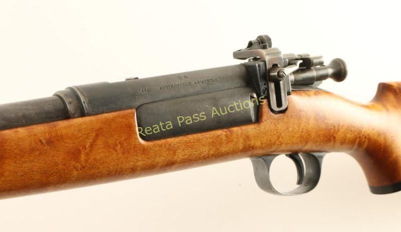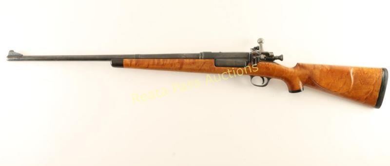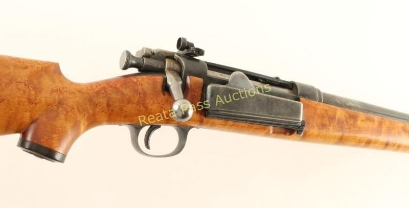 '2nd Type' Sporterized U.S. Military bolt action service rifle chambered in .30-40 Krag, circa 1894. Features a blued finish, 23.5" barrel, raised blade front sight, removed rear sight, unmarked receiver sight, side-mounted hinged magazine, straight bolt handle, manual safety, magazine cut-off, rounded trigger and smooth maple pistol grip shoulder stock with right handed cheek rest, black forend/pistol grip cap & recoil pad. Rifle retains approximately 30% of it's blued refinish showing large scattered losses & pin prick pitting on the barrel with a small amount of visible bluing on the top of the receiver and the balance turned to a dulled grey patina. Action is smooth, bore is bright with good rifling, and custom wood stock is fine. Condition is good+. ***Antique Firearm***