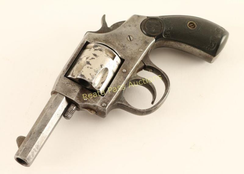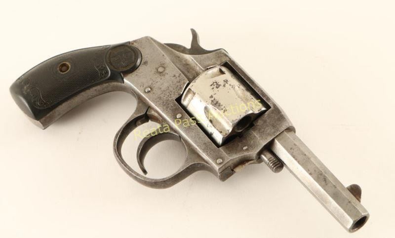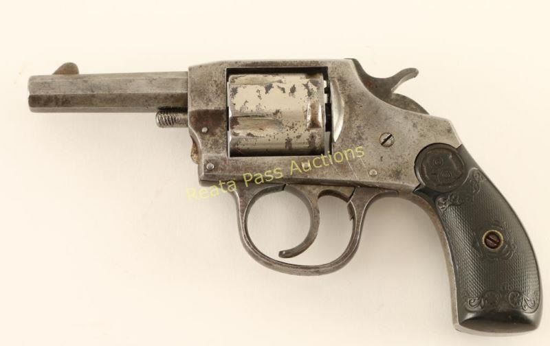 Vintage double-action revolver chambered for .32 centerfire. Features a nickel plated finish, 2.5" octagon barrel, blade front sight, channel cut rear sight, fluted five shot cylinder, smooth trigger, checkered hammer spur, and ornate two-piece checkered black hard rubber grips with owl heads on both panels. The cylinder exhibits approximately 70% of it's nickel plated finish with the balance of the revolver in-the-white showing scattered dark oxidation and pin prick pitting. Action functions well with play in the lock-up, bore is fair and grips are good with semi-worn checkering. Condition is fair. ***C&R Firearm*** ***Modern Firearm***