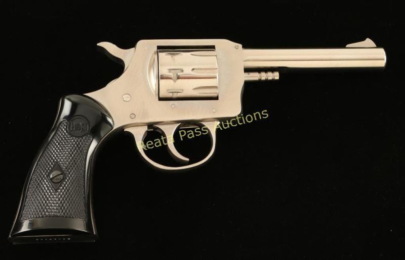 SN: BA017490 'Sidekick' Medium frame nine-shot double action revolver chambered in .22 Long Rifle, circa 1974-1986. Features a nickel plated finish, 4" barrel, patridge front sight, square notched rear sight, non-shrouded ejector rod, fluted cylinder, beveled trigger, serrated hammer spur, transfer bar safety, and two-piece diamond checkered black plastic grips with H&R insignias. Revolver exhibits light superficial scratches on the cylinder and barrel with no major wear observed. Action is sound with good lock-up, bore is excellent and grips are fine. Condition is near excellent. ***Modern Firearm***