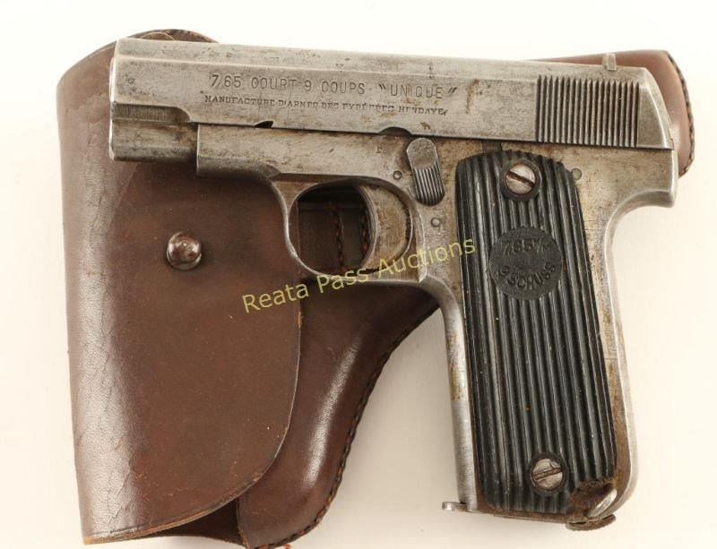 Nazi proofed semi-automatic pistol chambered in 7.65mm, produced under German control in Hendaye, France circa 1940-1945. Features a blued finish, 3.2" barrel, fixed sights, serrated trigger, steel frame, 9 round magazine lanyard loop and two-piece serrated black hard rubber grips. Includes a smooth brown leather belt loop flap holster. No import marks. Markings: Slide - "7,65 COURT 9 COUPS "UNIQUE"/MANUFACTURE D' ARMES DES PYRENEES HENDAYE". Frame - Eagle/WaA251, "51506", "S" & "F". Barrel - Eagle/swastika & "169". The pistol is primarily in the white with some finish observed under the grips. The exposed metal surfaces have a bright bare metal appearance with scattered dried grease, few examples of dark rust and some dark pin-prick pitting on the frame above the right grip. Action performs well, bore is near good showing a large patch of pitting/rust and hard rubber grips are very good. Condition is fair. ***C&R Firearm*** ***Modern Firearm***