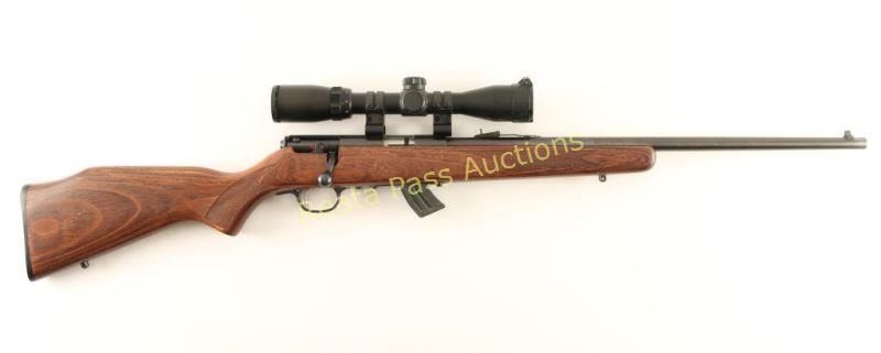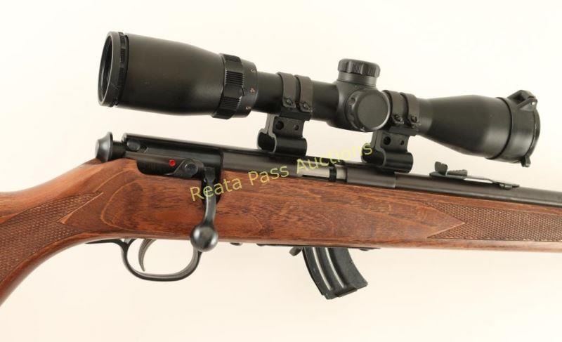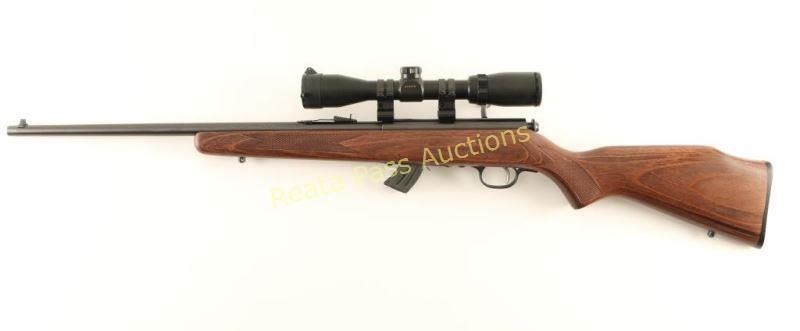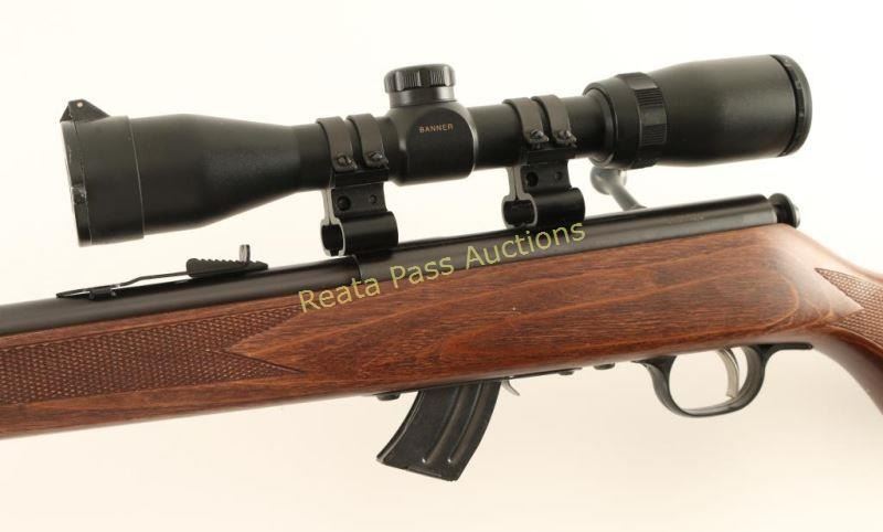 Canadian made bolt action sporting rifle chambered in .22 Long Rifle. Features a blued finish, 21" barrel, dovetailed blade front sight, adjustable rear sporting sight, Bushnell Banner 3-7x scope on see-thru rings, beveled trigger, 10 round magazine, smooth round bolt handle, manual safety, swivel studs and a checkered brown laminated wood pistol grip shoulder stock with high comb & black hard rubber buttplate. Rifle exhibits approximately 96% of it's blued finish showing some light handling marks/scratches on the barrel forward of the stock and some light freckles of oxidation on the barrel around the rear sight. Action is smooth, bore is pristine and stock is fine. Condition is near excellent. ***Modern Firearm***