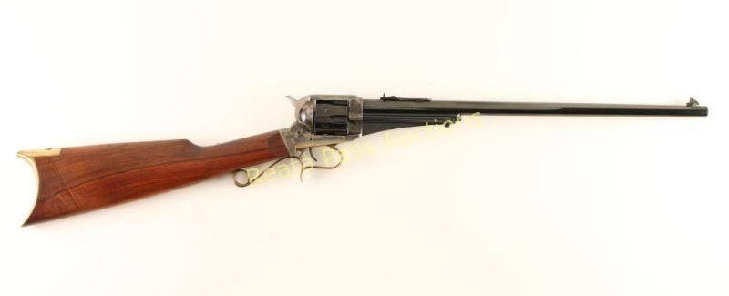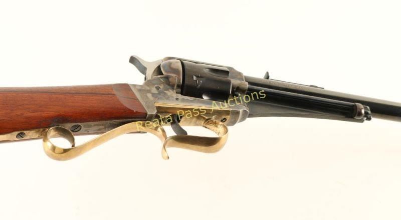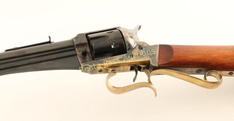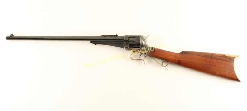 Italian made revolving carbine chambered in .44-40 Winchester, marketed by Navy Arms circa 1968-1984. Features a blued/case hardened finish, 18" barrel, dovetailed blade front sight, adjustable rear sporting sight, ejector rod, fluted six-shot cylinder, smooth trigger, brass finger-rest trigger guard, checkered hammer spur and straight grip wood shoulder stock with brass crescent buttplate. Rifle retains approximately 95% of it's original finish showing nice case colors, drag wear on the cylinder and some light scattered handling marks/scratches. Action is smooth, bore is excellent and wood stock is fine. Condition is near excellent. ***Modern Firearm***