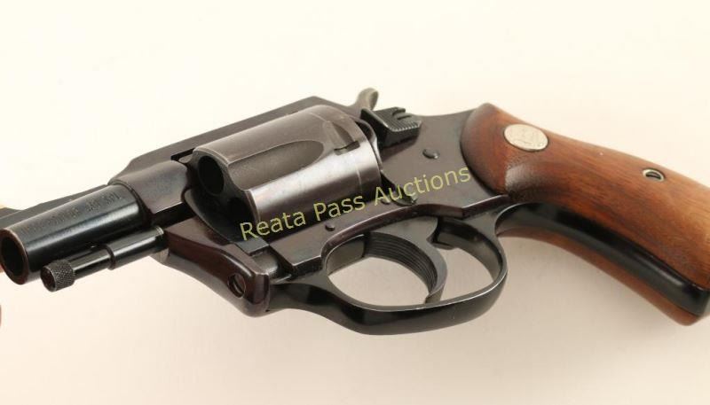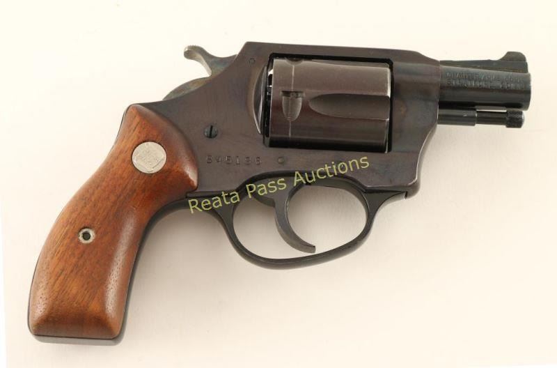 Small frame double-action snub-nosed revolver chambered in .38 Special. Features a blued finish, 1.8" barrel, ramped patridge front sight, square notched rear sight, fluted five shot cylinder, serrated trigger, non-shrouded ejector rod, serrated hammer spur, transfer bar safety, and two-piece smooth wood grips with Charter Arms medallions. Revolver exhibits approximately 94% of its blued finish showing a drag line on the cylinder, light holster wear, the frame & cylinder turned plum and some light scattered freckles of surface rust observed on the barrel & frame. Action is smooth with solid lock-up, bore is very good+ and rubber grips are near fine with a small chip on the top of the right panel. Condition is very good. ***Modern Firearm***