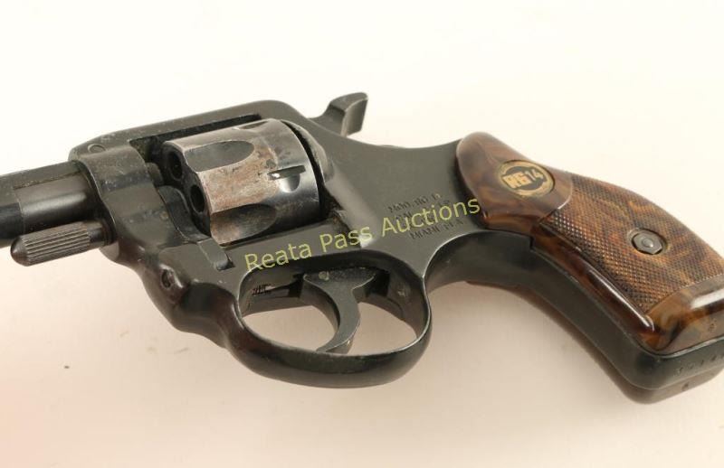 German made snub-nosed double action revolver chambered in .22 Long Rifle. Features a black finish, 1.75" barrel, fixed sights, fluted six-shot swing out cylinder, smooth trigger, wide serrated hammer spur and two-piece RG checkered faux wood plastic grips. Revolver retains approximately 78% of it's original finish showing flaking & wear with light rust on the cylinder. Action is strong with solid lock-up, bore is bright with light pitting near the muzzle and plastic grips are very good. Condition is good. ***Modern Firearm***