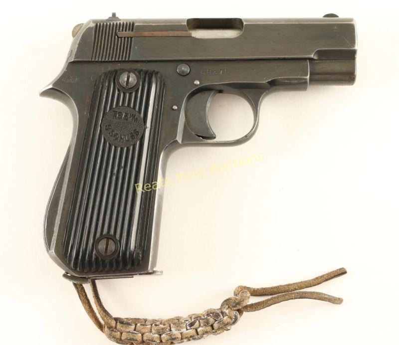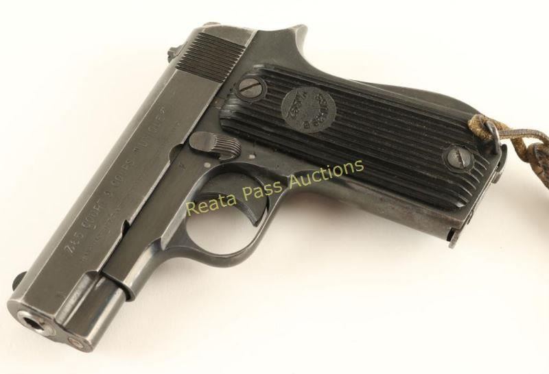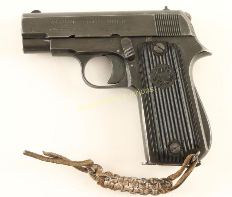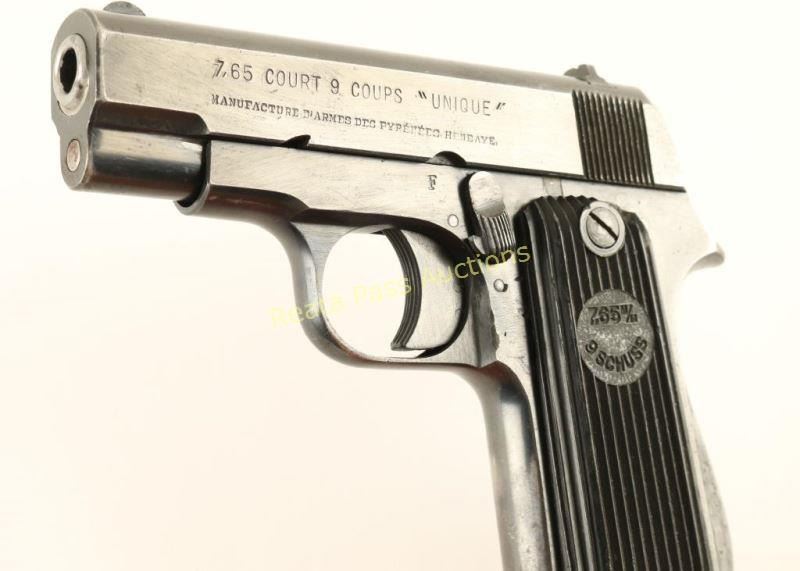 Nazi proofed single-action semi automatic pistol chambered in 7.65mm, produced during German occupation in Handaye, France circa 1940-1945. Features a nice blued refinish, 3.25" barrel, blade front sight, dovetailed rear window sight, serrated trigger, thumb safety, serrated round hammer spur, magazine safety, 9 round magazine, lanyard loop with braided leather lanyard, serrated backstrap and two-piece grooved black hard rubber grips. No import marks. Markings: Slide - "7,65 COURT 9 COUPS "UNIQUE"/MANUFACTURE D'ARMES DES PYRENEES HENDAYE". Frame - Eagle/WaAD20 & "68370". The numbers "283" are stamped on the barrel, on the inside of the slide and on the inside of the frame. Pistol exhibits approximately 88% of it's blued refinish showing light handling wear/marks and a few small scattered areas of light pitting. Action is sound, bore is excellent are grips are very good with some small losses. Condition is good to very good as refinished. ***C&R Firearm*** ***Modern Firearm***