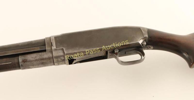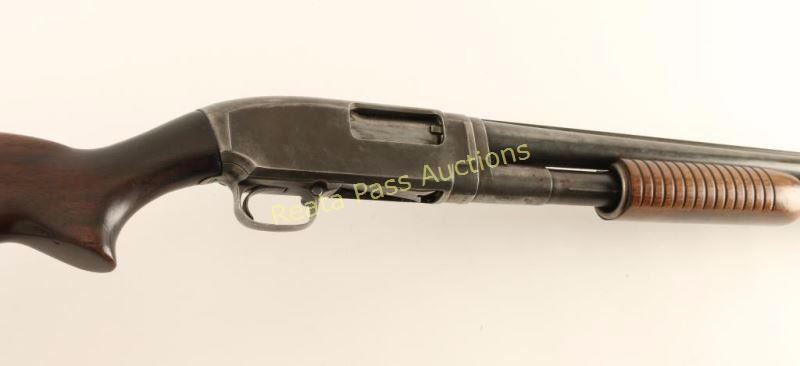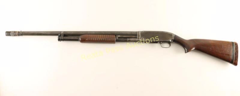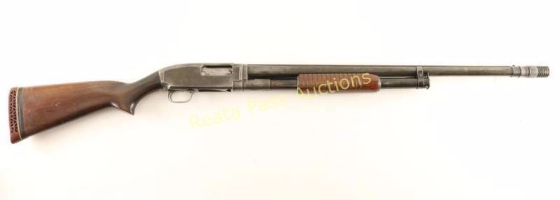 SN: 1416353 Vintage take-down slide action repeating shotgun chambered for Super Speed & Super-X 3" 12 gauge shells, circa 1954. Features a blued finish, cut-down 25" barrel with Poly Choke adjustable choke system & solid rib, brass bead front sight, 2/3 length tube magazine, smooth trigger, push button safety, grooved walnut slide handle and smooth pistol grip shoulder stock with wood extension, two plastic extensions, White Line recoil pad & 14 1/8" LOP. Shotgun exhibits less than 10% of it's original finish honest wear with the majority of the metal surfaces drifted to a soft grey patina. Action is smooth, bore is bright with some debris near the muzzle and wood stocks are good with a few hairline cracks observed around the wrist & the aforementioned extensions. Condition is near good. ***C&R Firearm*** ***Modern Firearm***