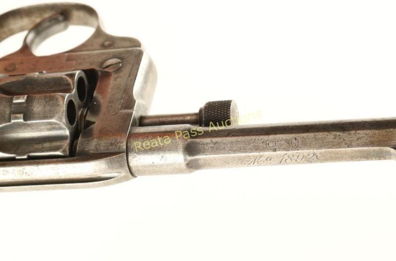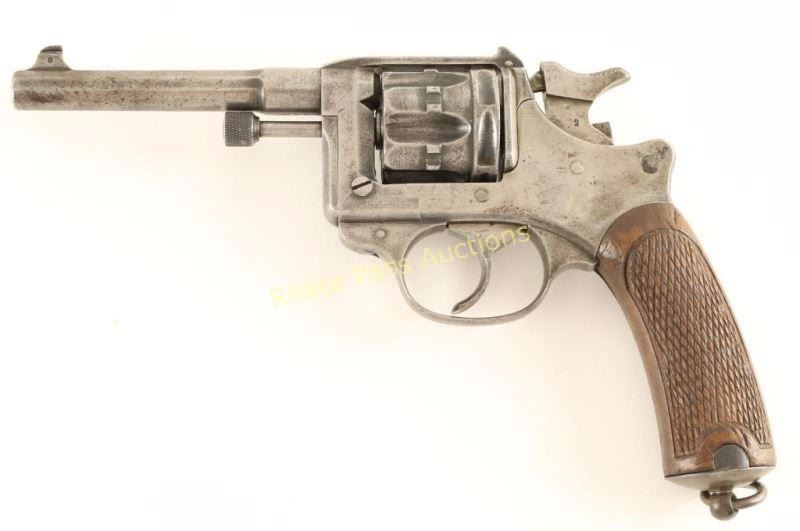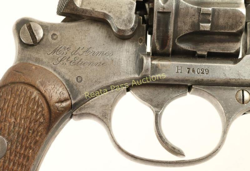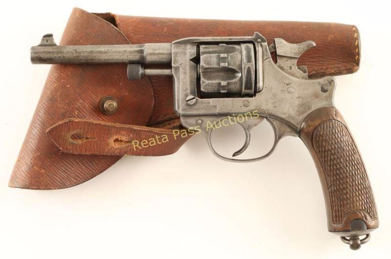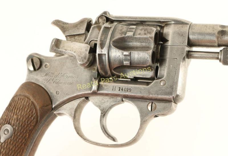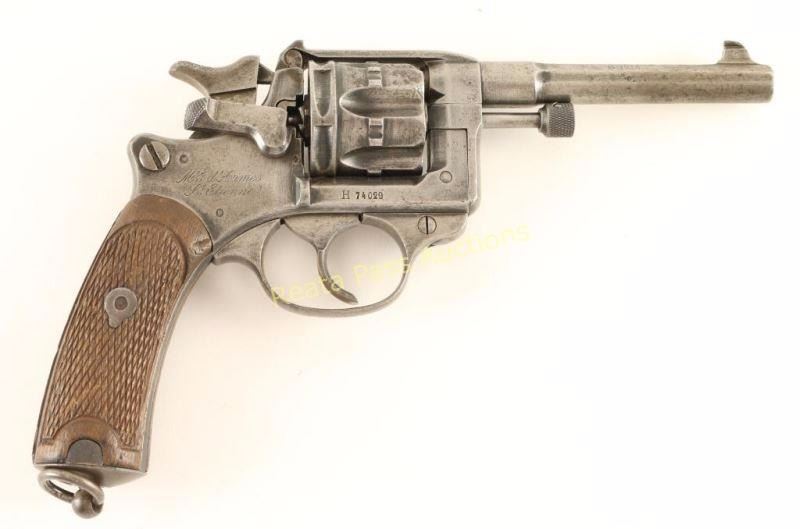 'Lebel' French military double action service revolver chambered in 8mm, circa 1915. Features a blued finish, 4.6" barrel, blade front sight, notched rear window sight, smooth trigger, checkered hammer spur, fluted six-shot cylinder, non-shouded ejector rod, swing-out side plate, lanyard ring and two-piece checkered wood grips. Includes a brown leather belt loop flap holster. No import marks. Markings: Barrel - "Mle 1892", "S1915" & a circled "C" stamped twice. Frame - "Mre d'Armes/St. Etienne" & "H74029". Revolver is in-the-white with a small amount of finish retained in protected areas and some light scattered pitting evident on the barrel. Action performs well, bore is good+ with a small patch of pitting near the muzzle and the wood grips are good to very good as worn semi-smooth. Condition is good+. ***C&R Firearm*** ***Modern Firearm***