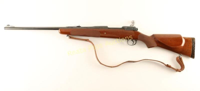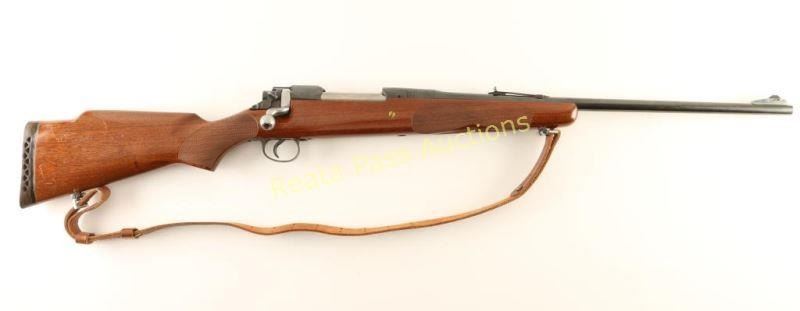Sporterized US made military bolt-action rifle with aftermarket sights, a custom stock for right-handed shooters, sling swivels, drilled and tapped, and a petrified recoil pad. This has been reblued after the rear sight ears were tastefully machined off and the finish is good. Wood stock has checkered panels at pistol grip and forend. Butt has a Monte Carlo comb with cheek rest. There is a brass recoil lug cross-bolt. Bore is frosty with sharp rifling. Action works well. *Modern Firearm C&R*
