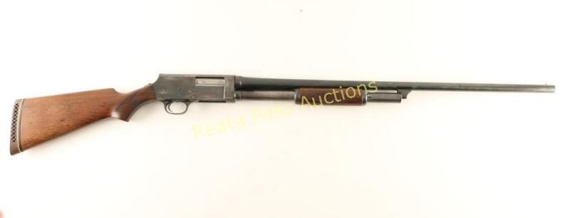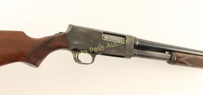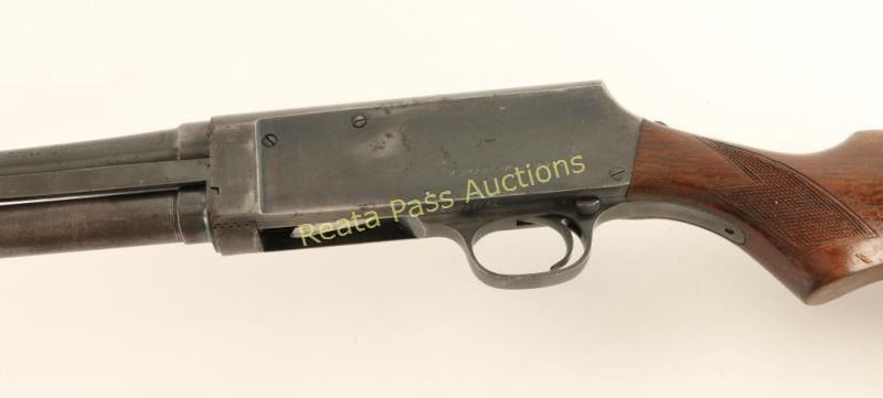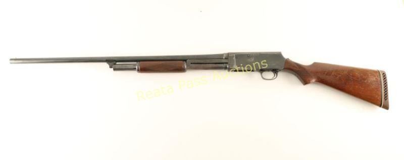 Vintage take-down slide-action repeating shotgun chambered for 2 3/4" 20 gauge shells. Features a blued finish, 28" barrel, silver bead front sight, 1/2 length tube magazine, steel hump-back receiver, smooth trigger, sliding tang safety, checkered walnut slide handle and pistol grip wood shoulder stock with Browning recoil pad. Shotgun exhibits approximately 60% of it's blued finish showing moderate wear & light scattered surface rust on the barrel and heavy wear & oxidation on the magazine tube & receiver. Action performs well, bore is very good+ and wood stocks are good+ with approximately 50% varnish retained. Condition is near good. ***C&R Firearm*** ***Modern Firearm***