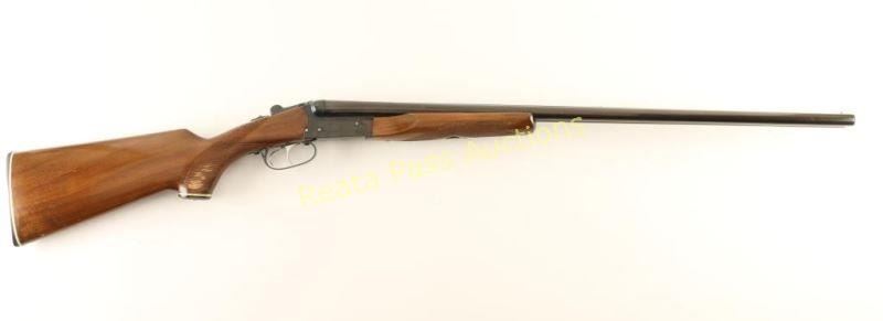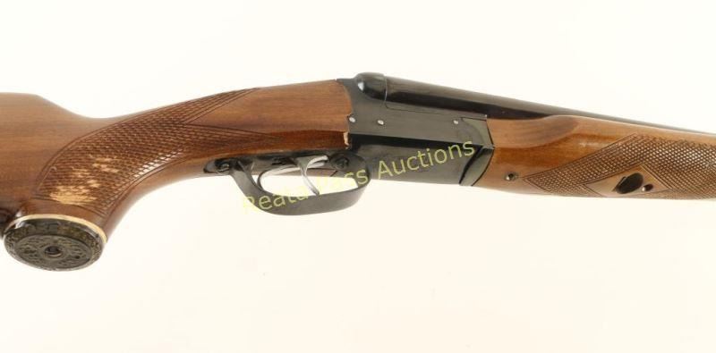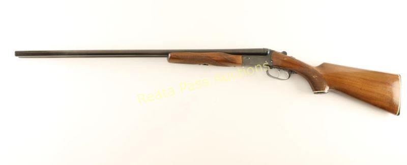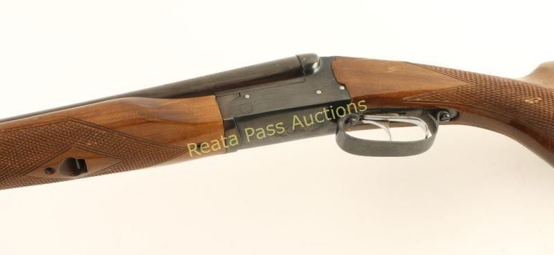 Blued, side-by-side double barreled shotgun with 2-3/4" chambers, 28" barrels, double underlugs, double triggers, fixed chokes (unmarked), 2 brass beads, no barrel selector, extractor, beavertail forend, white line black plastic grip cap and butt plate. Barrels and forend iron are starting to turn plum and the barrels have a few rubs. Receiver has a few scrapes and rubs. Bores are bright and shiny. Action works well. Forend has coarse checkering and a few rubs. Butt has coarse checkering, chips and scratches. Butt plate is loose and over sized. Condition is good. *Modern Firearm*