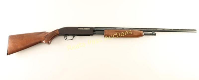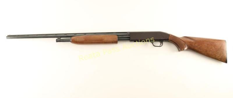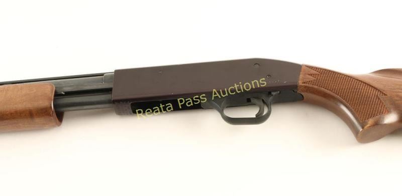 Blued and anodized, pump-action, tube magazine fed shotgun with a 26" barrel, full choke, 3" chamber, raised ventilated sight rib, front bead sight, checkered wood forend, pistol grip wood butt stock and a black plastic butt plate. Bluing has some surface rust and light wear. Anodized receiver has three small scratches. Bore is mirror bright. Action works well. The safety switch is broken but still engages the safety. Forend has a few small dings. Butt has rubs and dings. Butt plate has scratches at heel and toe. Condition is good to very good. *Modern Firearm*