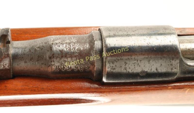 Italian made WWII military bolt-action rifle with a 21" barrel, fixed rear sight, sling swivel and steel butt plate with a trapdoor. Metal finish is freckled from surface rust and turning to a silver color. Bore is dark and dirty but has lots of rifling and may clean to better. No import mark. Action functions well. Stock may have been refinished. It is cut for the folding blade bayonet. Butt plate sits proud of the wood of the butt. Condition is fair to good. *Modern Firearm C&R* *Modern Firearm C&R*