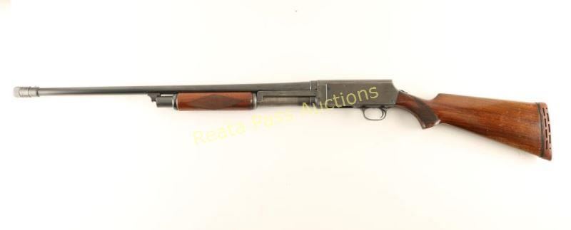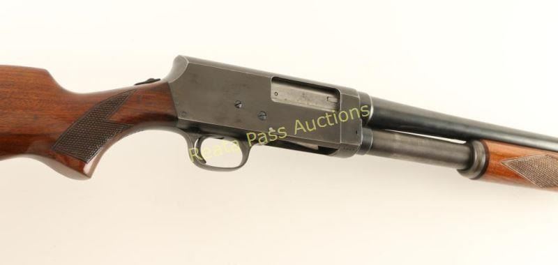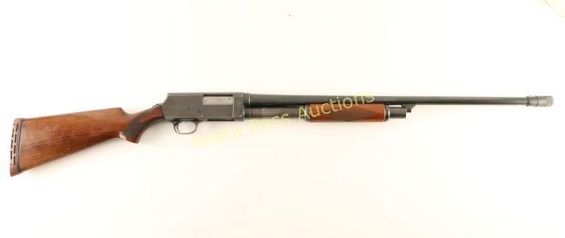 Vintage take-down slide-action repeating shotgun chambered for 2 3/4" 16 gauge shells. Features a blued finish, 26 1/4" barrel with a Poly Choke adjustable choke system, silver bead front sight, 1/2 length tube magazine, steel hump-back receiver, smooth trigger, sliding tang safety, checkered walnut slide handle and pistol grip wood shoulder stock with an aftermarket recoil pad. Shotgun exhibits approximately 60% of it's blued finish showing heavy slide wear on the magazine tube and heavy thinning on the receiver. Action performs well, bore is excellent and wood stocks are very good. Condition is good++. ***C&R Firearm*** ***Modern Firearm***