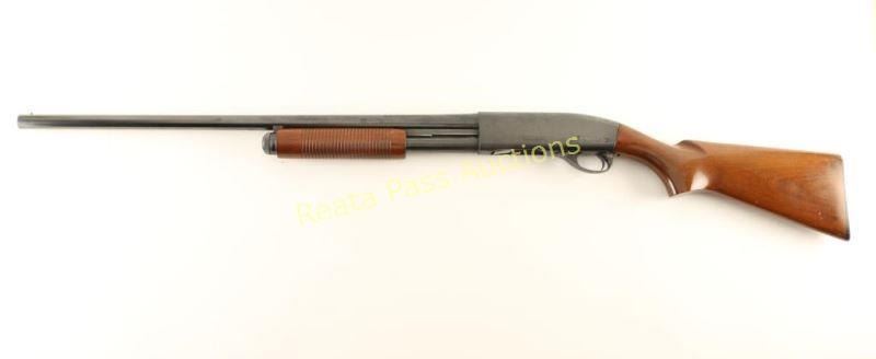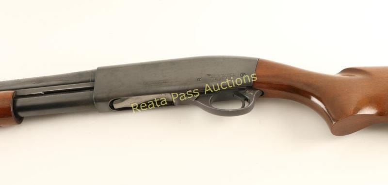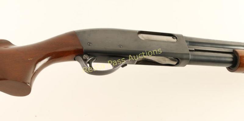 Blued, pump-action, tube magazine fed shotgun with a 26" barrel, Improved Cylinder choke, 2-3/4" chamber, single bead front sight, hardwood furniture and a black plastic butt plate. Bluing is in good condition with wear only on the magazine from the pump action. The alloy trigger guard has some edge wear and has faded to a soft grey color. The bore is mirror bright. The action works well. The forend is ribbed with few scrapes. The finish on the butt is crazed with a few small scrapes and scratches. Buttplate has very few scratches. Condition is very good to excellent. *Modern Firearm*