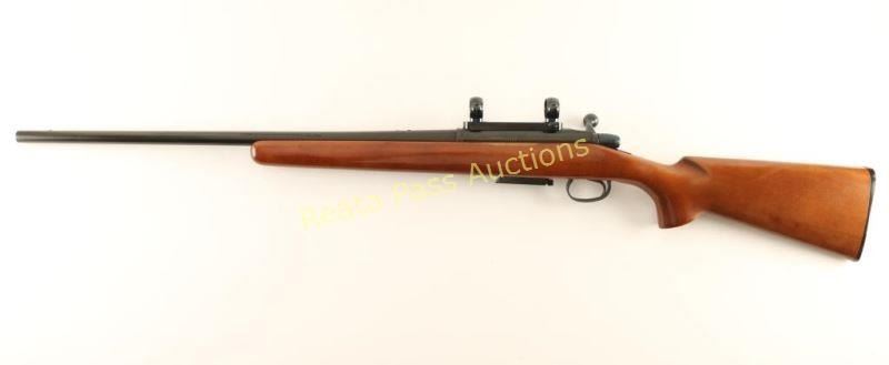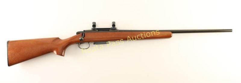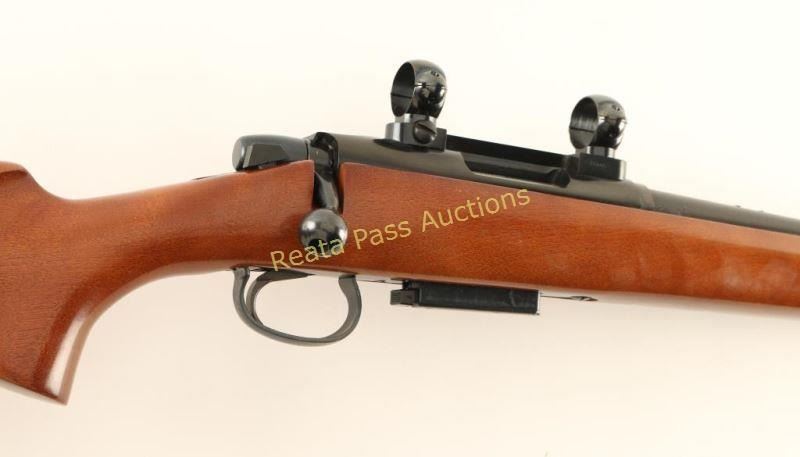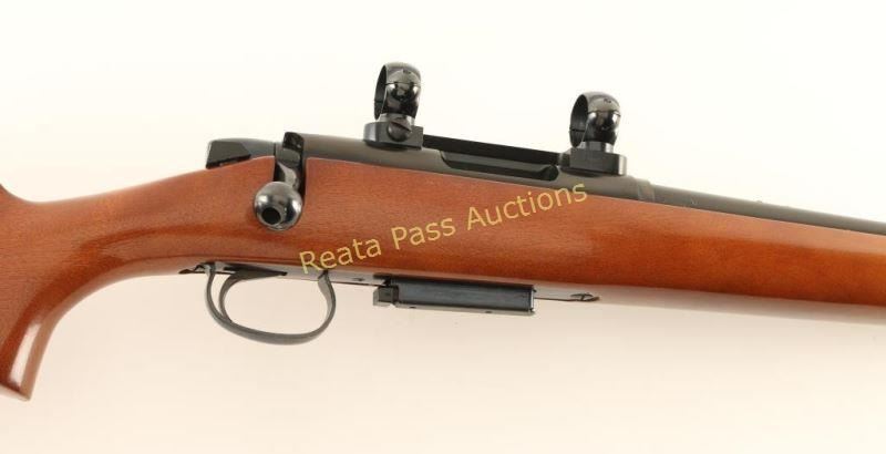 Magazine fed bolt action sporting rifle chambered in .223 Remington, circa 1967-1983. Features a blued finish, 24" tapered barrel, removed sights, Burris scope mount & rings, manual safety, 4 round magazine, beveled trigger and pistol grip wood shoulder stock with factory black hard rubber buttplate. Rifle retains approximately 99% of it's original finish showing little to no visible wear. Action is smooth, bore is excellent and wood stock is near fine with a small loss on the bottom of the pistol grip & a few small nicks below the ejection port. Condition is excellent. ***Modern Firearm***