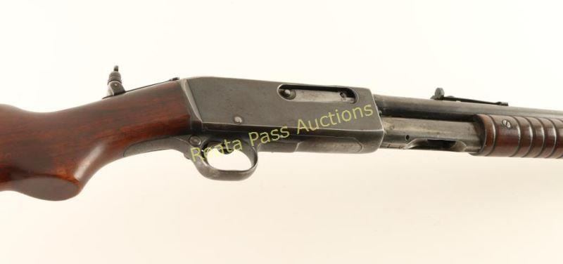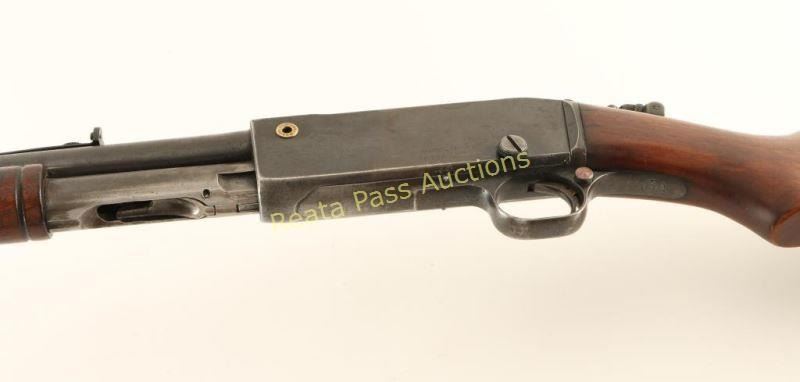 Blued, pump-action, tube magazine fed, takedown rifle with a 21.75" barrel, broken front sight blade, non-factory adjustable rear sight, Marbles tang sight, wood furniture and steel butt plate. Bluing is worn/faded to a silver/grey with surface rust, freckles, edge wear and some general wear. Bore is shiny with good rifling. Action works well. Wood forend is dark and has one crack at the front as well as scratches and dings. The butt has scratches, dings and one gouge. The wood appears to have shrunk away from the butt plate which is worn to silver and has scuffs, scratches and surface rust freckles. Condition is fair to good for its age. *Modern Firearm C&R*