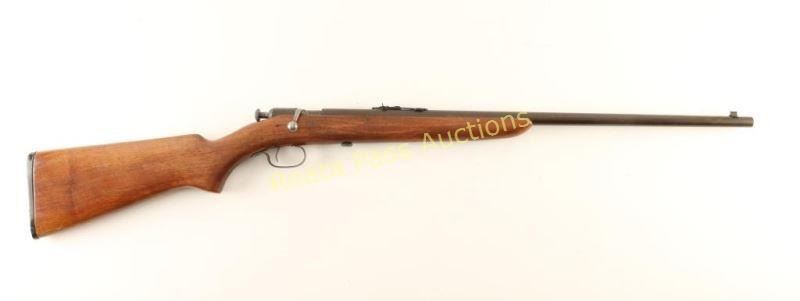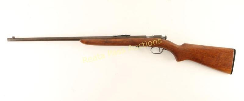 Vintage manual-cocking single shot bolt-action rifle chambered in .22 Short, Long & Long Rifle, circa 1931-1939. Features a blued finish, 23" barrel, dovetailed blade front sight with brass bead, adjustable rear sporting sight, bent bolt handle with round knob, serrated cocking piece, smooth trigger and one-piece walnut pistol grip should stock with factory black hard rubber buttplate. Rifle exhibits light traces of the original blued finish in protected areas with the balance of the metal surfaces turned to a nice aged brown patina. Action performs well, bore is good++ with a few dark rings toward the muzzle and wood stock is very good. Condition is good. ***C&R Firearm*** ***Modern Firearm***