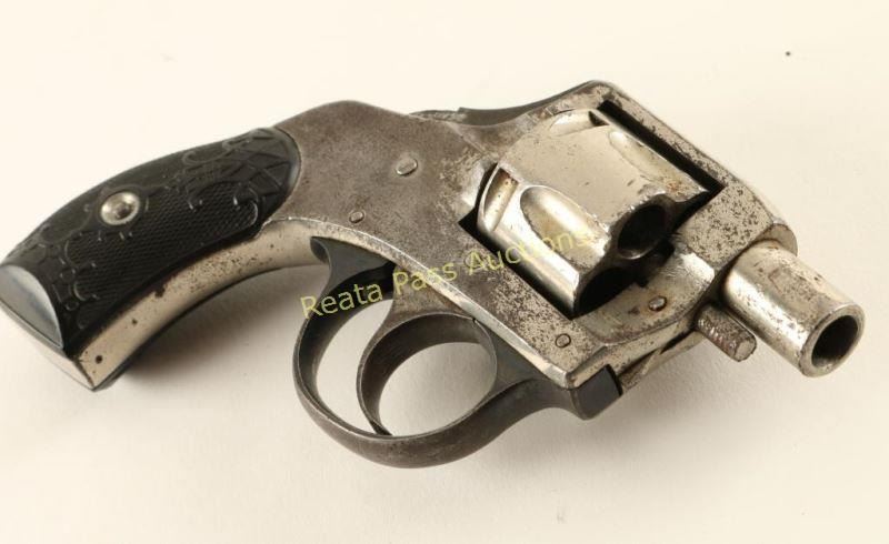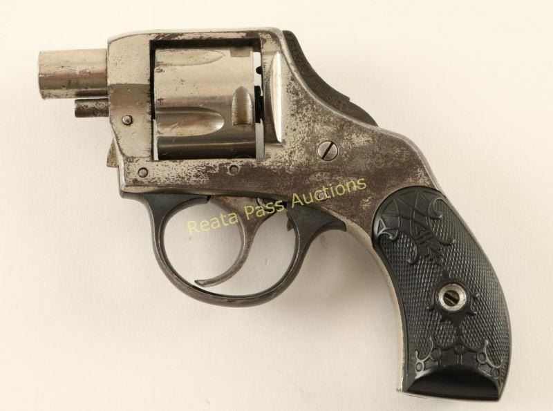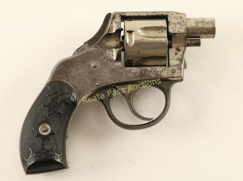 SN: 3376 'Safety Hammer Second Variant' Antique double-action-only medium frame revolver chambered in .32 black powder cartridge, circa 1891-1904. Features a nickel plated finish, 1.1" barrel, no sights, spurless hammer, smooth trigger, blued triggerguard and ornate two-piece checkered black hard rubber grips. Revolver retains approximately 40% of it's nickel plated finish showing heavy losses. Action is fair as the trigger doesn't rotate the cylinder 100% of the time, bore is smooth and hard rubber grips are very good. Condition is good. ***Antique Firearm***