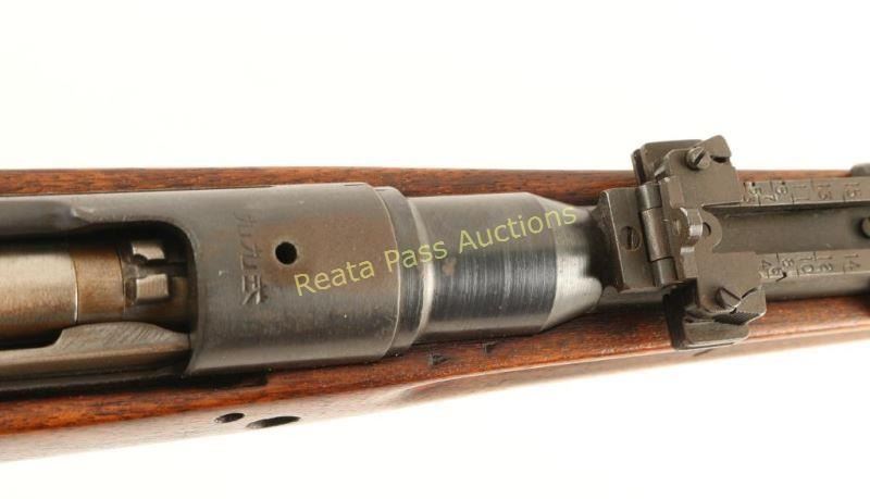 Japanese WWII military bolt-action rifle made at the Kokura Arsenal (series 21) with a cut-down original spliced stock, hinged floor plate, mismatched bolt body, monopod base on rear barrel band, sling swivels, cupped steel butt plate and a ground "Mum". The rear sight is missing the anti-aircraft sighting arms. No import marks. Metal finish is good with light surface rust on some areas. Where the stock and the hand guard were removed the finish is very good. The bottom metal and butt plate have turned to a grey color. Bore is a little frosty with good rifling. Action works well. Stock appears to have been refinished and has some dings and scratches. Condition is fair to good. *Modern Firearm C&R*