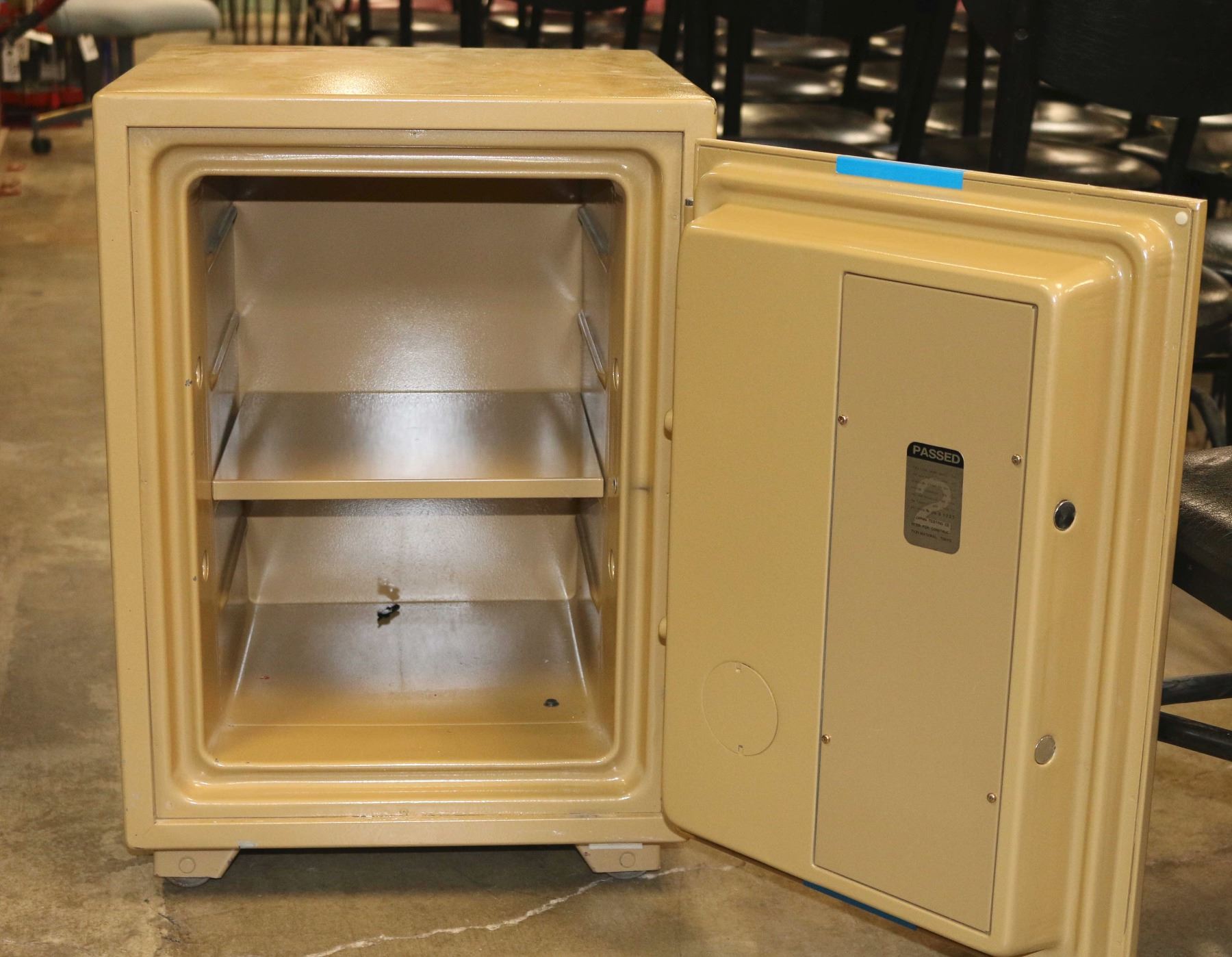 The Saga Mighty Maxi Safe. Model 1190, combination and key for extra protection. Fire rated 2 hours at 1700* Weighs 206 Lbs, measures Approx 18x19x26. Has wheels and one shelf.