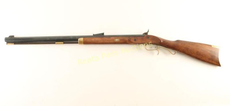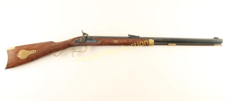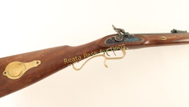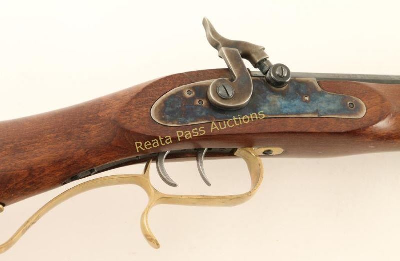 SN: 14-13-042458-03. Blued, case-hardened percussion rifle with a 28" octagon barrel, adjustable rear sight, half-stock, double set triggers and brass; ramrod ends, thimbles, nosecap, escutcheons, triggerguard, patch box and buttplate. It is missing a thimble. The barrel and underlug bluing has light edge wear and scratches. Case hardened wedge, hammer and lock plate still show good color. Brass is tarnished dull with some scratches. Patch box contains a cleaning jag. Bore is dark and dirty or rusty with lots of strong rifling. Action works well. Wood has a few dings and rubs. Condition is fair to good. *Antique Firearm*
