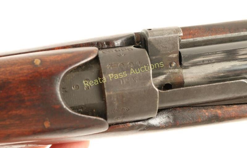 Australian made WWI British Commonwealth bolt-action battle rifle with a 25" barrel, mismatched bolt, mismatched magazine, leather sling and a full wood stock. Made in 1916. Metal finish is worn to a dull grey with edge wear on high points. Bore looks a little frosty with good rifling. Muzzle cap matches receiver serial number. Brass butt plate has many small dings. Wood stock has stamping that matches receiver serial number. There are also other stamps with numbers and one that has "CMD" over "5MD". The front handguard has a small crack at the front of the rear sight and another at the lower barrel band. There are numerous dings, dents and scratches but no other cracks. The leather sling is a little stiff and dry. Condition is good. *Modern Firearm C&R*