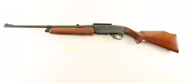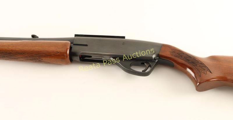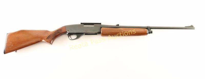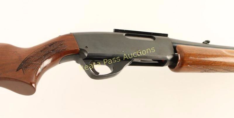 Blued, pump-action, tube magazine fed rifle with a 22" barrel, sling studs, adjustable folding rear sight, Weaver style 1-piece scope mount, alloy trigger guard, checkered hardwood furniture and a black plastic buttplate. Bluing has edge wear at muzzle and on receiver bottom. Trigger guard has edge wear and scuffs/scratches. Bore is bright and shiny with good rifling. Action works well. Wood has scrapes, scratches and rubs and the buttstock has a Monte Carlo comb. Condition is fair to good. *Modern Firearm*