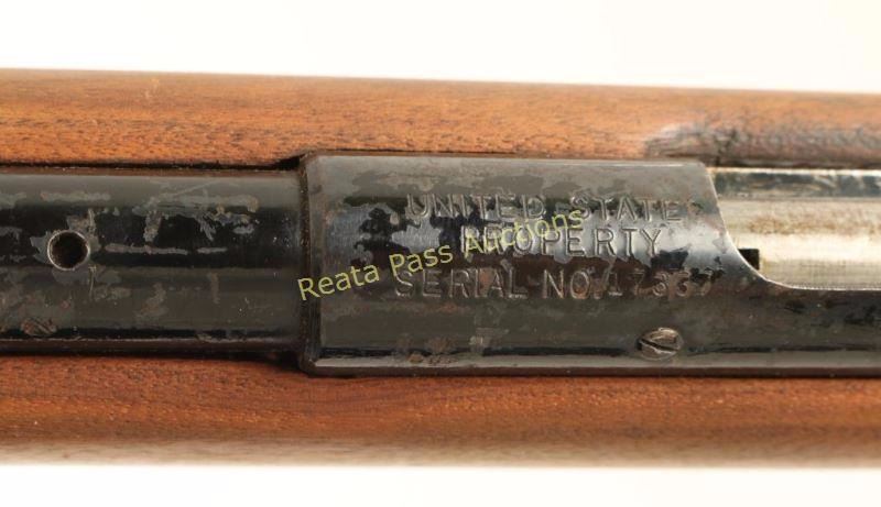Blued, painted, bolt-action, box magazine fed military training rifle with a 23" barrel, no rear sight, marked "United States Property", British proofs, forward sling swivel, plastic trigger guard, checkered steel butt plate with trapdoor and it is drilled and tapped for scope mount and receiver sight, Safety doesn't work. No magazine. trapdoor will hod a magazine in the space behind it. Paint is peeling/chipping away and the bluing underneath it is in good shape with slight edge wear. Butt plate has surface rust at heel and toe. One spot of rust on barrel band. Bore is bright and shiny with strong rifling. Action works well (aside from the safety not functioning). Wood appears to have been stripped and has a few dings. Condition is fair to good. *Modern Firearm*