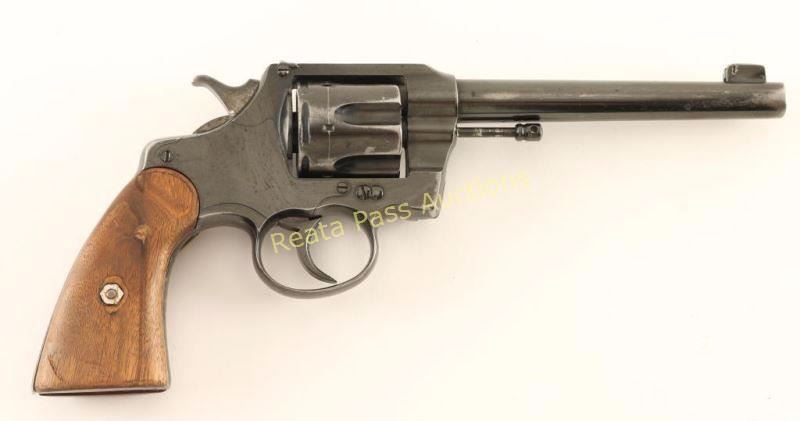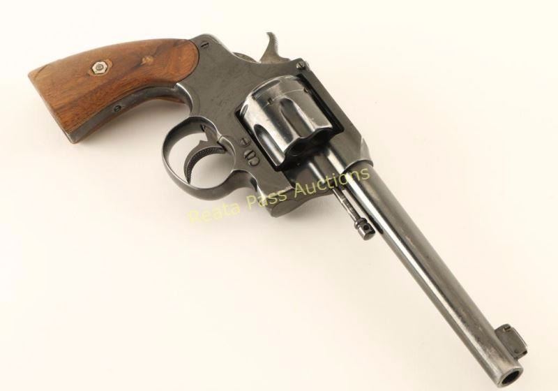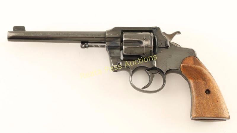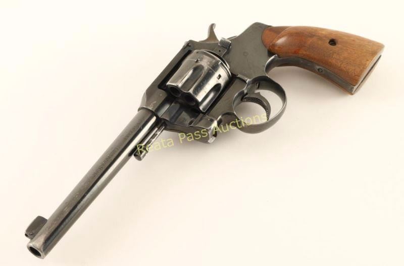 Vintage double action revolver chambered in .38 Special. Features a blued refinish, 6" barrel, pinned blade front sight with elevation adjustment, flat top frame, low-profile drift-adjustable rear sight, fluted six-shot cylinder, non-shrouded ejector rod, checkered trigger, hammer spur & backstrap, and custom two-piece smooth wood grips with thumb rest on the right panel. Stamped "7508" on the crane, yolk & cylinder release latch, also inspector marked with "HHA" stamped on the butt. Revolver exhibits approximately 77% of it blued refinish showing moderate to heavy holster wear, light scattered oxidation on the right side of the barrel & frame, and a small amount of pin prick pitting on the cylinder. Action is mechanically sound, bore appears near excellent with what may be a few minute areas of very light rust, and wood grips are good. Condition is good as refinished. ***C&R Firearm*** ***Modern Firearm***