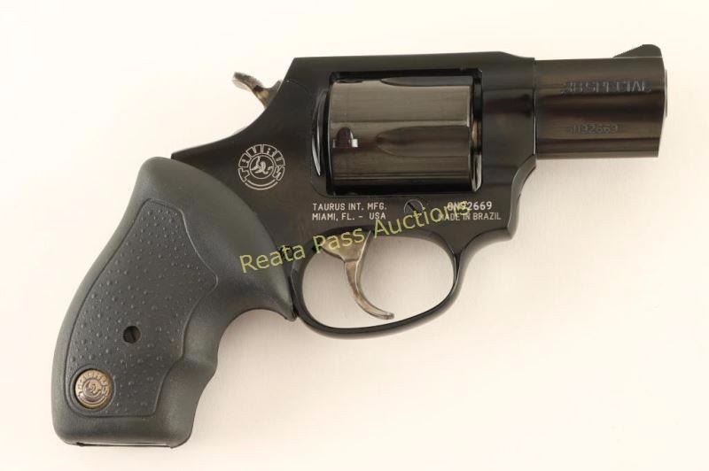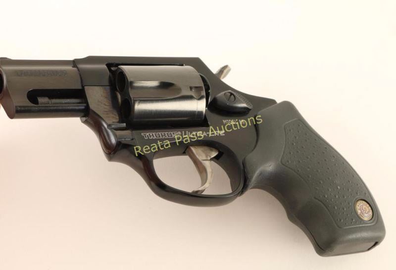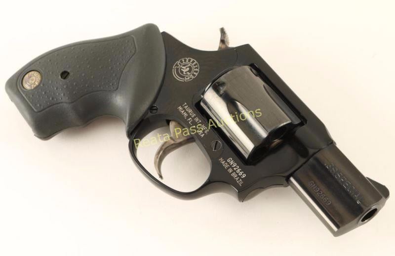 Brazilian made small frame snub-nosed revolver chambered in .38 Special. Features a blued finish, 2" barrel with full underlug, ramp front sight, square notched rear sight, fluted five-shot cylinder, smooth trigger, checkered hammer spur, internal locking safety, and two-piece pebbled black rubber grips with Taurus medallions. Includes the original factory cardboard box with documents and keys. Revolver exhibits approximately 99% of it's blued finish with only a faint drag line observed. Action is sound with solid lock-up, bore is excellent and rubber grips are fine. Condition is near new in box. ***Modern Firearm***