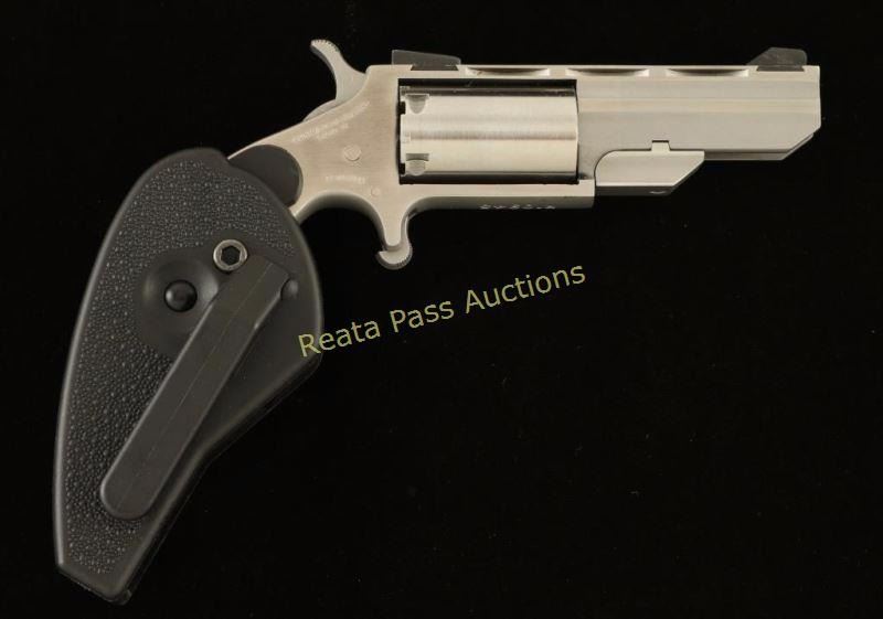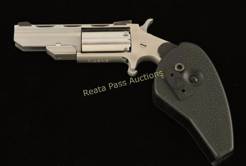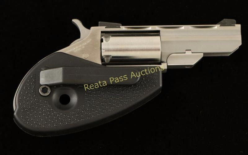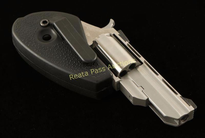 SN: R10945 Miniature stainless steel spur trigger revolver chambered in .22 Magnum. Features a brushed/matte finish, heavy 2" vent rib barrel, Marble Arms fixed low-profile sights, non-fluted five-shot cylinder, serrated spur trigger, serrated hammer spur and NAA pebbled black plastic folding grip with pocket clip. Revolver exhibits some scratches/scuffs from carrying and edge wear on the sights. Action is sound with very god lock-up, bore is excellent and plastic grip is fine. Condition is very good+++. ***Modern Firearm***