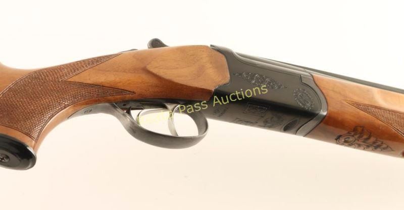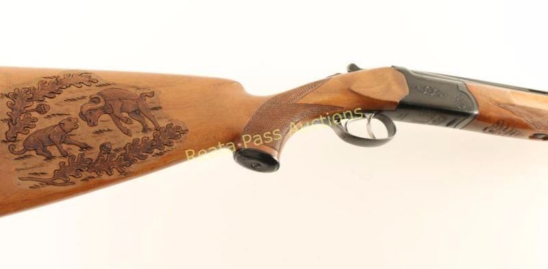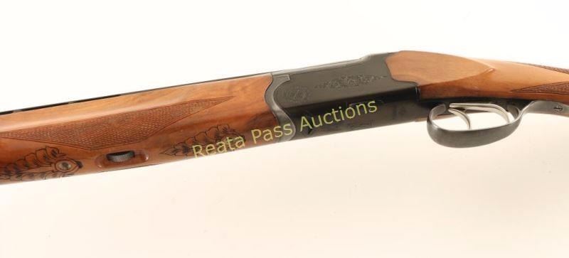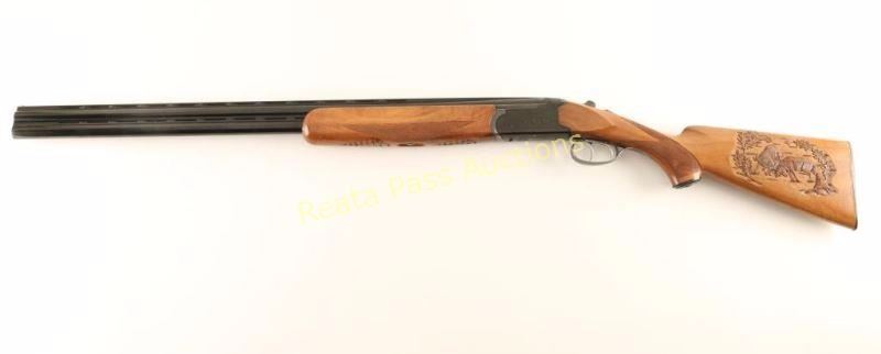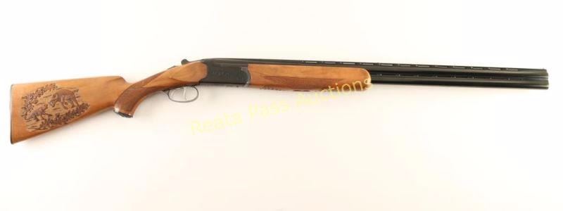 SN: 97.4294 Blued , over/under, 28" barreled, Made in Turkey shotgun with ventilated spacer, ventilated raised sight rib, front and mid beads, changeable choke tubes, extractor, double underlugs, double triggers, manual safety, 2-piece checkered and carved stock set and plastic grip cap and butt plate. Bluing has a few tiny dings in the finish. The trigger guard and forend iron are going grey. The bores are dirty but shiny. Action works well. Wood has checkered panels on forend and pistol grip with decorative carving on the forend and wildlife fight scenes in oak leaves on the butt. Both pieces have a few rubs and dings. Buttplate has a few scrapes on the toe and heel. Condition is very good to excellent. *Modern Firearm*