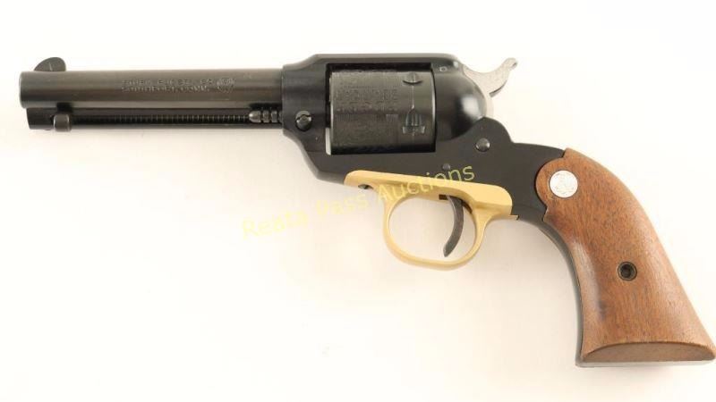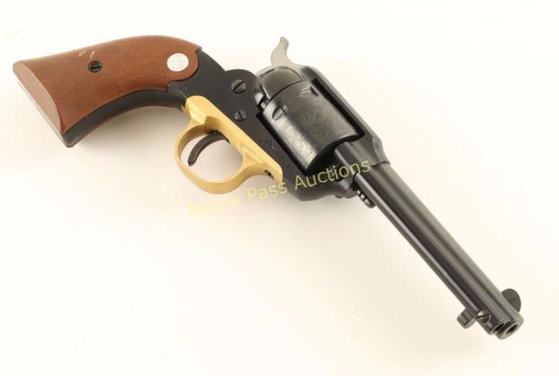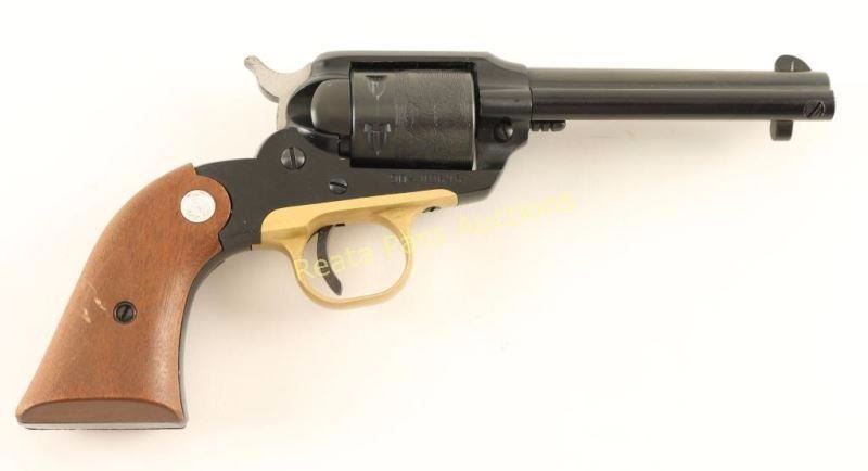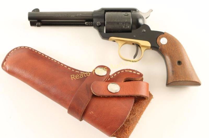 ‘Old Model’ Small frame single action revolver modeled along the lines of the Remington 1890 and chambered in .22 Long Rifle, circa 1969. Features a blued/black anodized finish, 4" barrel, ejector rod, patridge front sight, square notched rear sight, alloy frame, non-fluted six shot cylinder with roll-stamped scene, brass colored anodized alloy trigger guard, serrated hammer spur, and Ruger Medallion two-piece smooth wood grips. Includes a Hunter smooth brown leather belt loop holster. Revolver exhibits approximately 94% of it’s original finish showing a faint drag line and light holster wear/handling marks on the barrel. Action is crisp, bore is excellent, and grips very good with a few minor blemishes. Condition is very good+++. ***Modern Firearm***