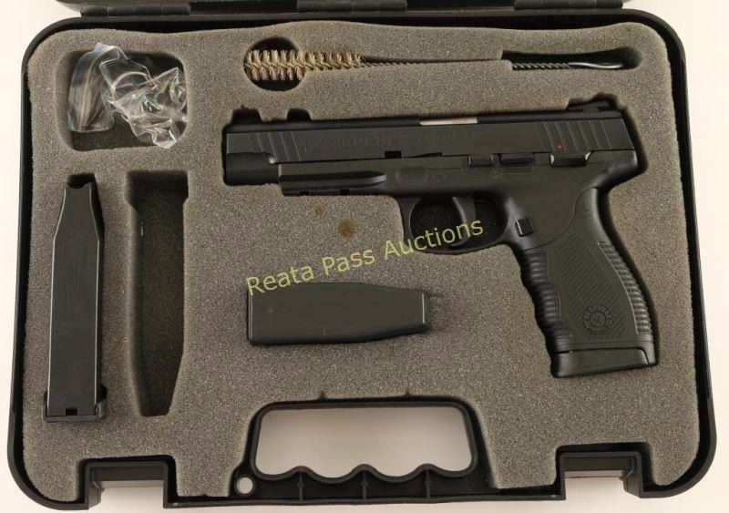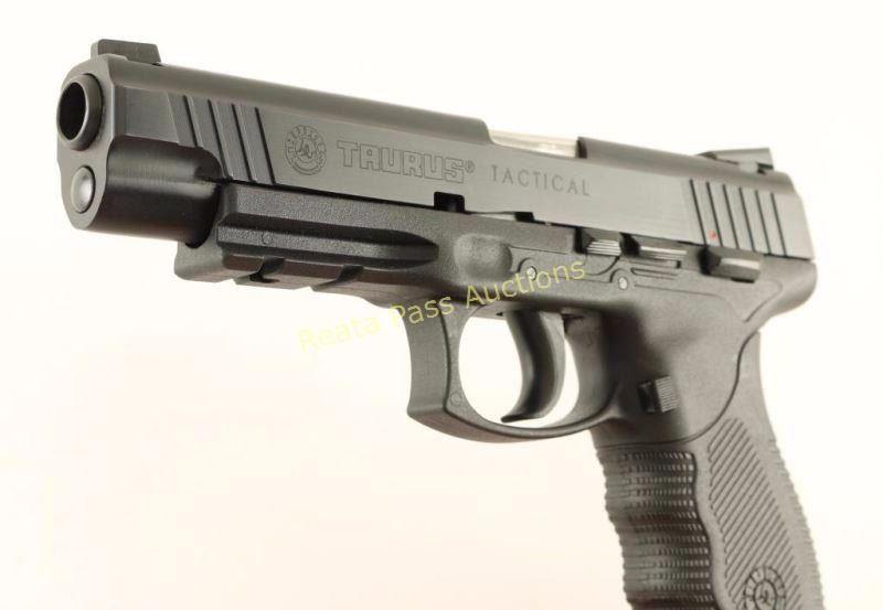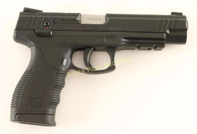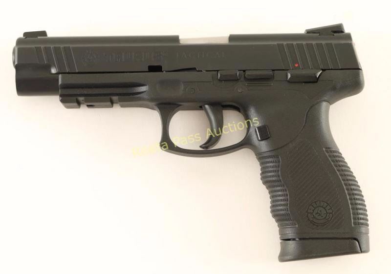 'Tactical' Brazilian made full size double-action semi-automatic pistol chambered in .45 Automatic. Features a black finished slide with dual cocking serrations, 5.25" barrel, Novak's three-dot drift adjustable sights, cocked indicator, ambidextrous thumb safety, internal locking safety, smooth trigger, push button magazine release, 12 round magazine, and black polymer frame with integral accessory rail & finger groove grip. Includes the original factory hard case with documents, extra magazine, speed loader, keys and brush. Pistol exhibits approximately 98% of it's black finish with few minor handling marks and shows light slide wear on the barrel. Action is crisp, bore is excellent and polymer frame is fine. Condition is excellent in box. ***Modern Firearm***